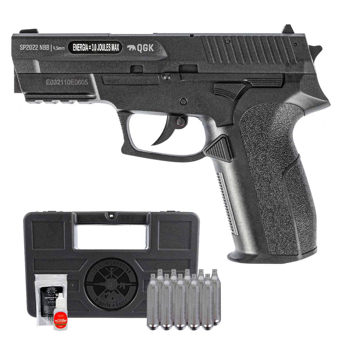 Acompanha uma maleta LojaDaCarabina para facilitar na hora do transporte, um pacote de esferas de aço 1000 Un, 10 cilindros de Co2 12g e um óleo de silicone para manutenção do equipamento.