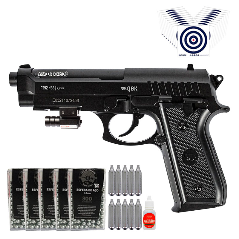 PISTOLA DE PRESSÃO PT92 BERETTA QGK 4.5 MM + MIRA LASER + ESFERAS ROSSI + CO2 + ÓLEO + ALVOS ROSSI