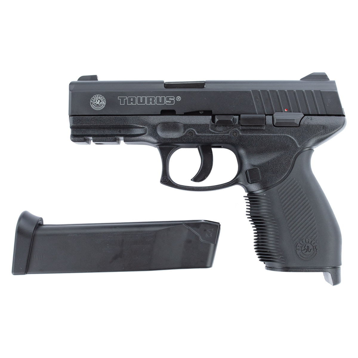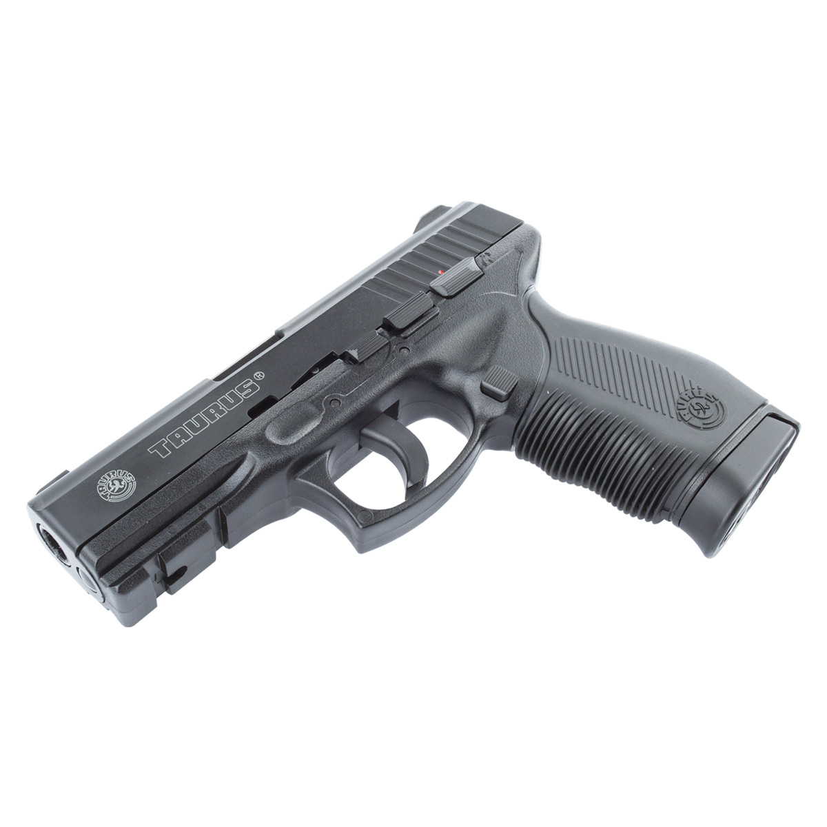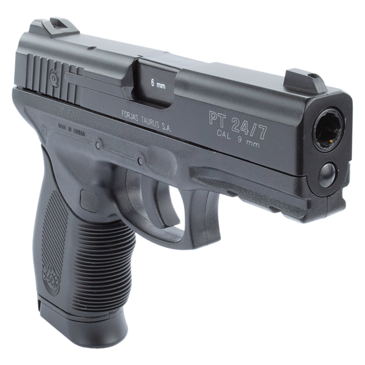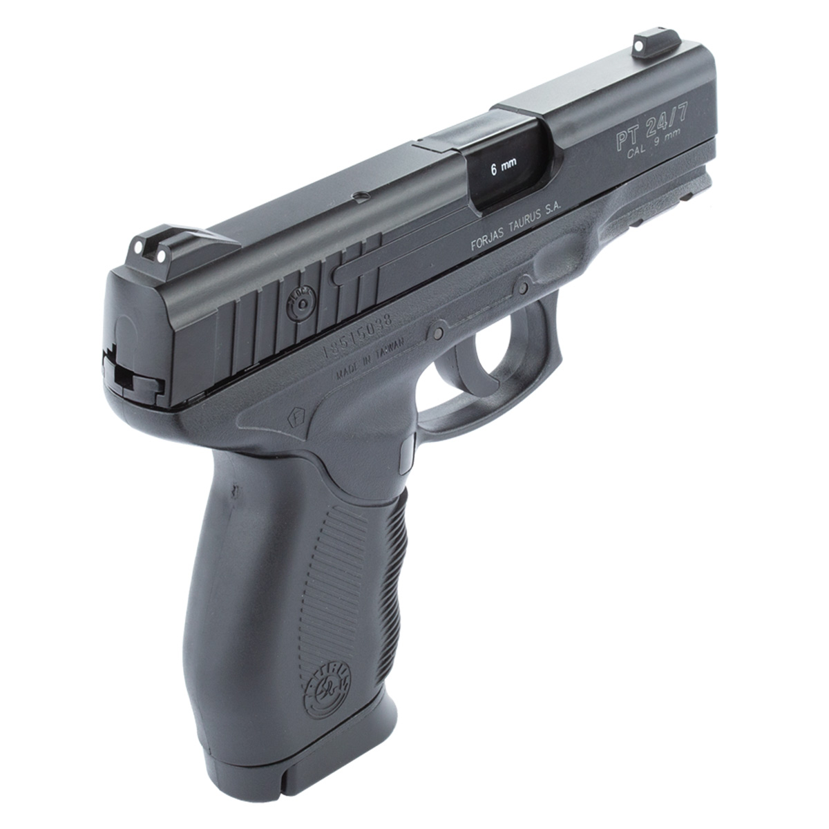 Pistola 24/7 para esferas de aço 6mm, possui cano em metal tornando seu peso mais realista. Possui alça e massa de mira, ótima empunhadura emborrachada, sistema de disparo por Co2, não possui trava de segurança, não possui blowback (slide fixo).