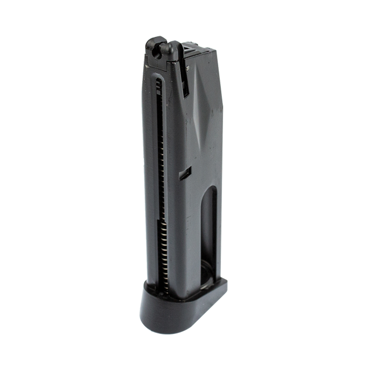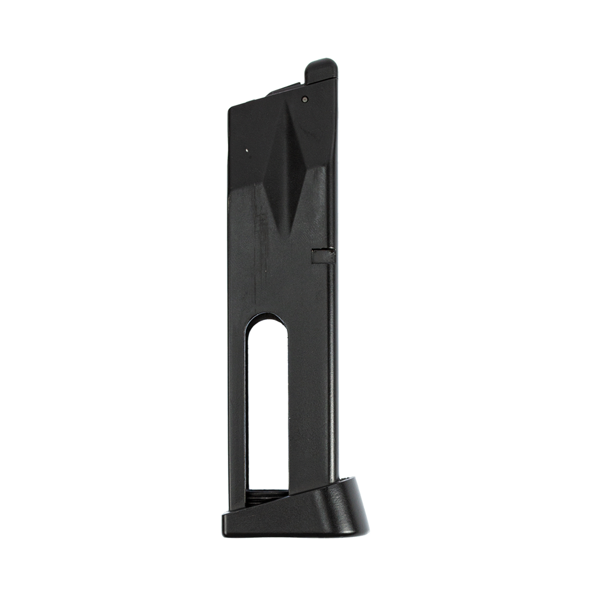 Seu magazine é em metal e nele será inserido o cilindro co2 de 12g. Esse magazine possui capacidade para até 19 esferas de aço no calibre 4.5mm (.177). Não é compatível com chumbinhos, somente esferas de aço.