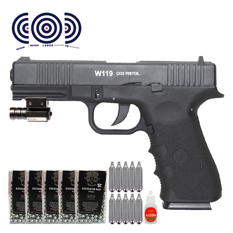 Pistola de Pressao Co2 Glock W119 BlowBack 4.5mm + Mira Laser + Esferas + CO2 + Oleo + Alvos