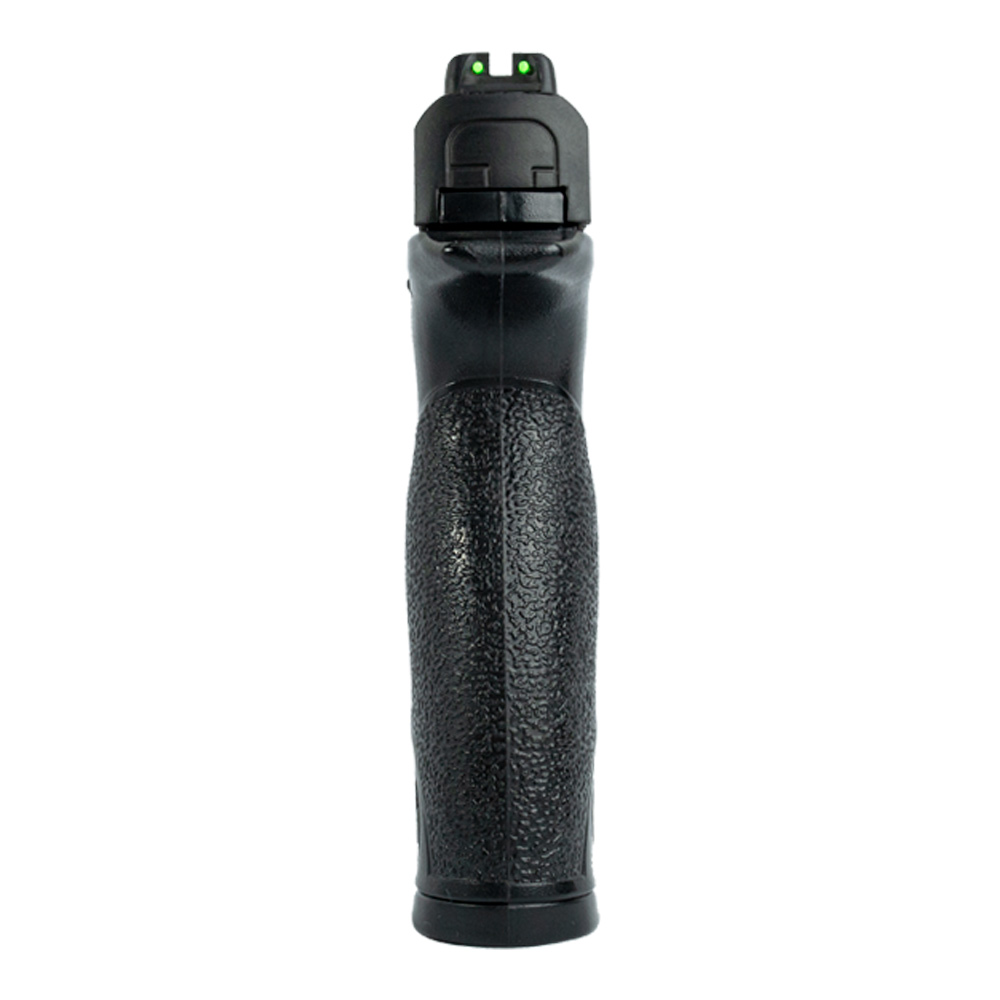 Conta com mira frontal fixa com ponto branco e mira traseira fixa com fibra óptica verde.