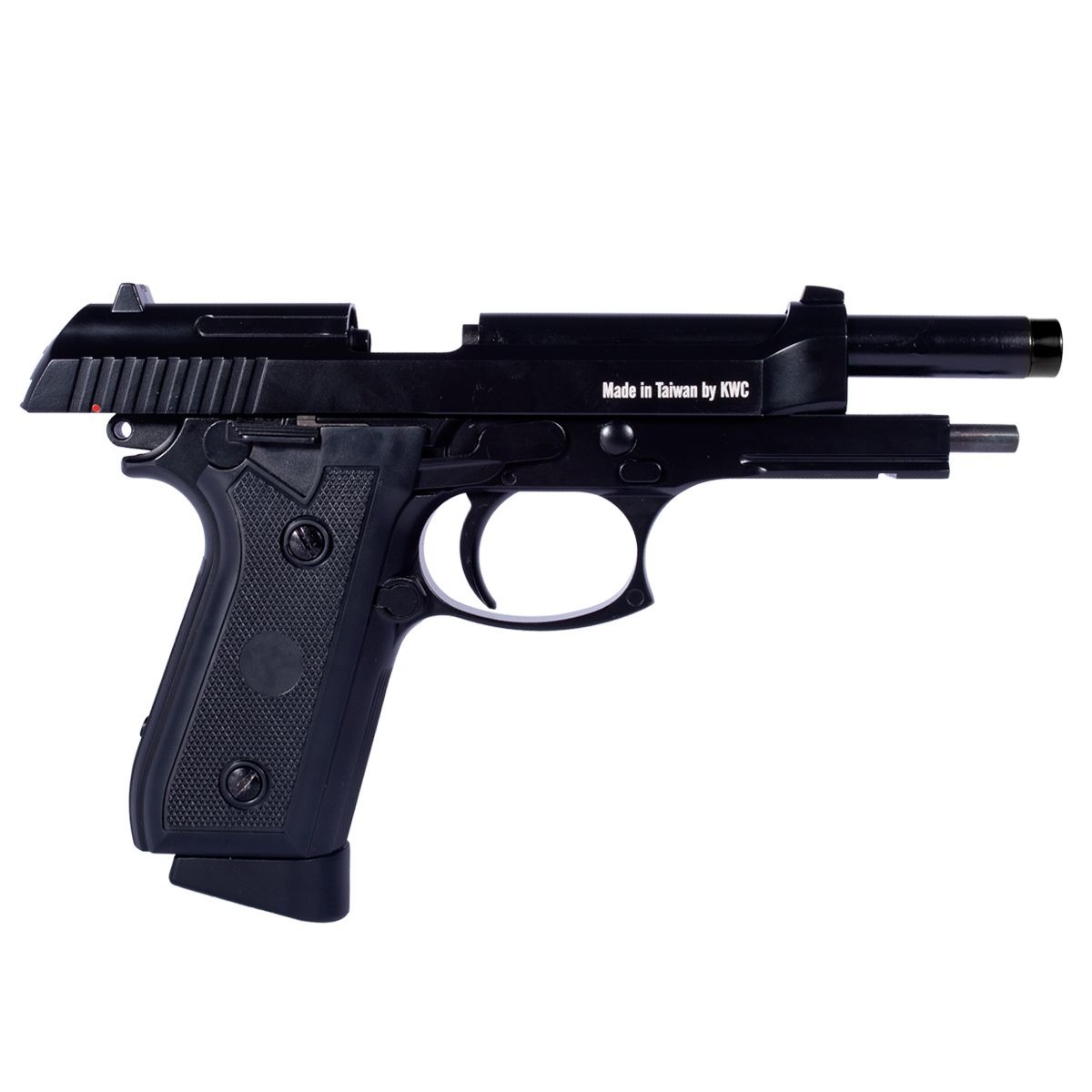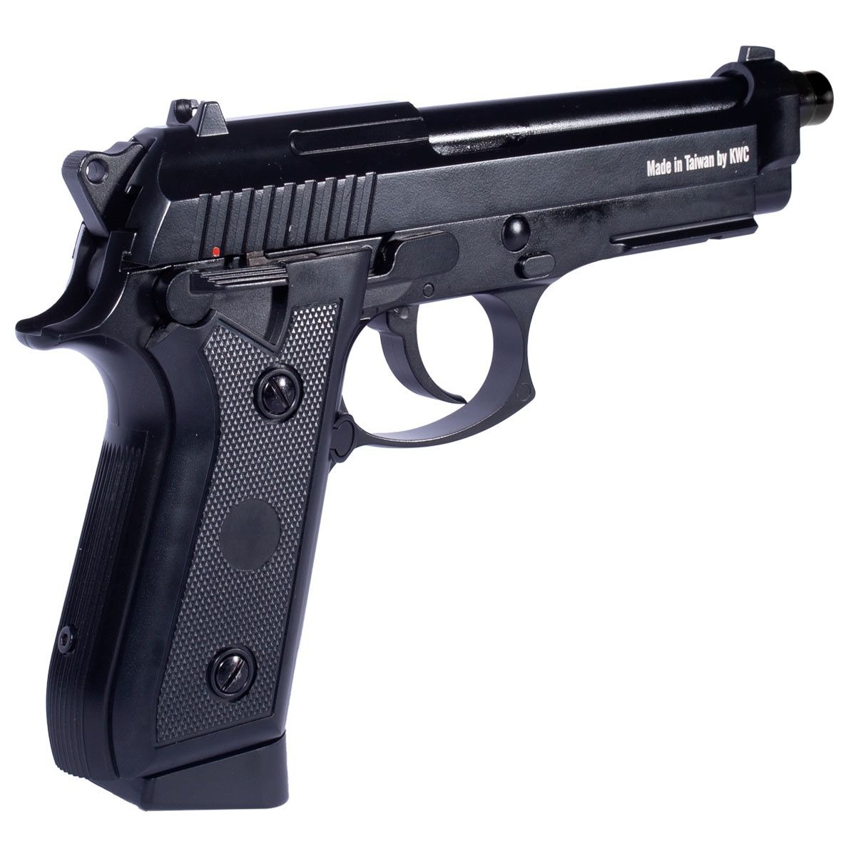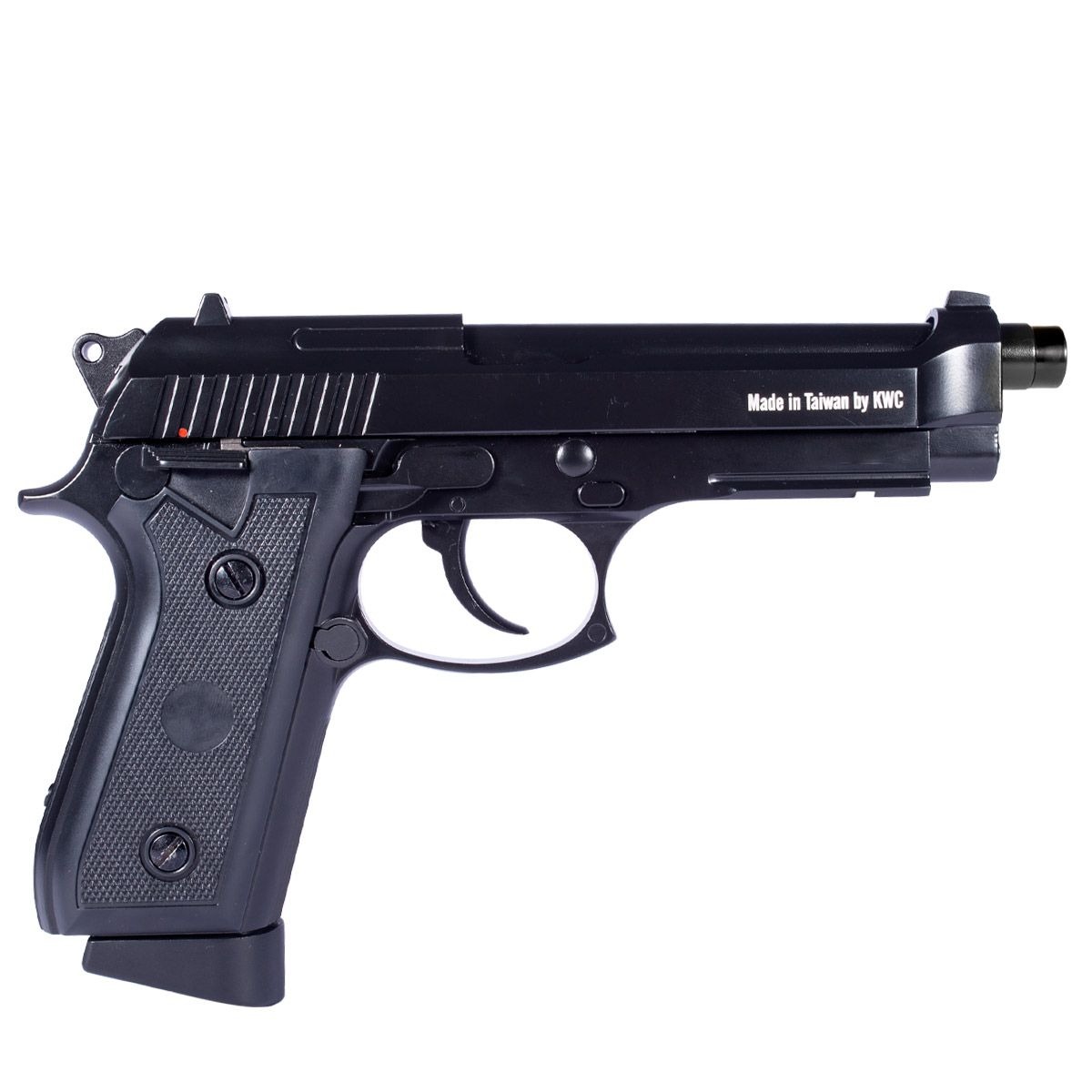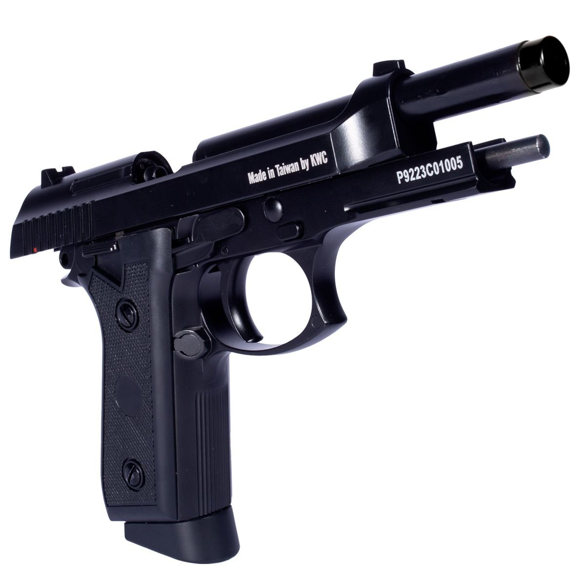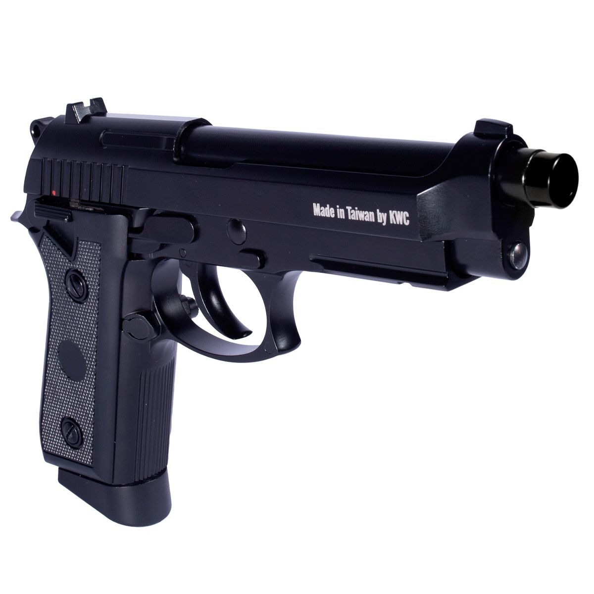 Pistola Co2 fabricada pela KWC modelo PT92 com Blowback no calibre 4.5mm. Uma Pistola de Pressão que tem alto realismo, com simulação de recuo (blowback) e sistema de propulsão por co2 (utiliza para alimentação um cilindro co2 de 12g).