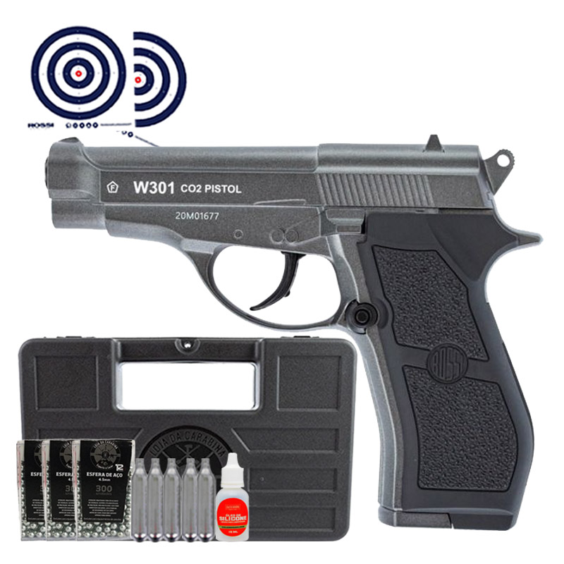 A W301 utiliza esferas de aço calibre 4.5mm e possui magazine para 20 tiros, trava de segurança manual e ação dupla, combinando praticidade e confiabilidade. Compacta e precisa, mede 17,5 cm com cano de 108 mm, sendo perfeita para colecionadores, entusiastas e quem busca uma pistola para tiro esportivo recreativo.