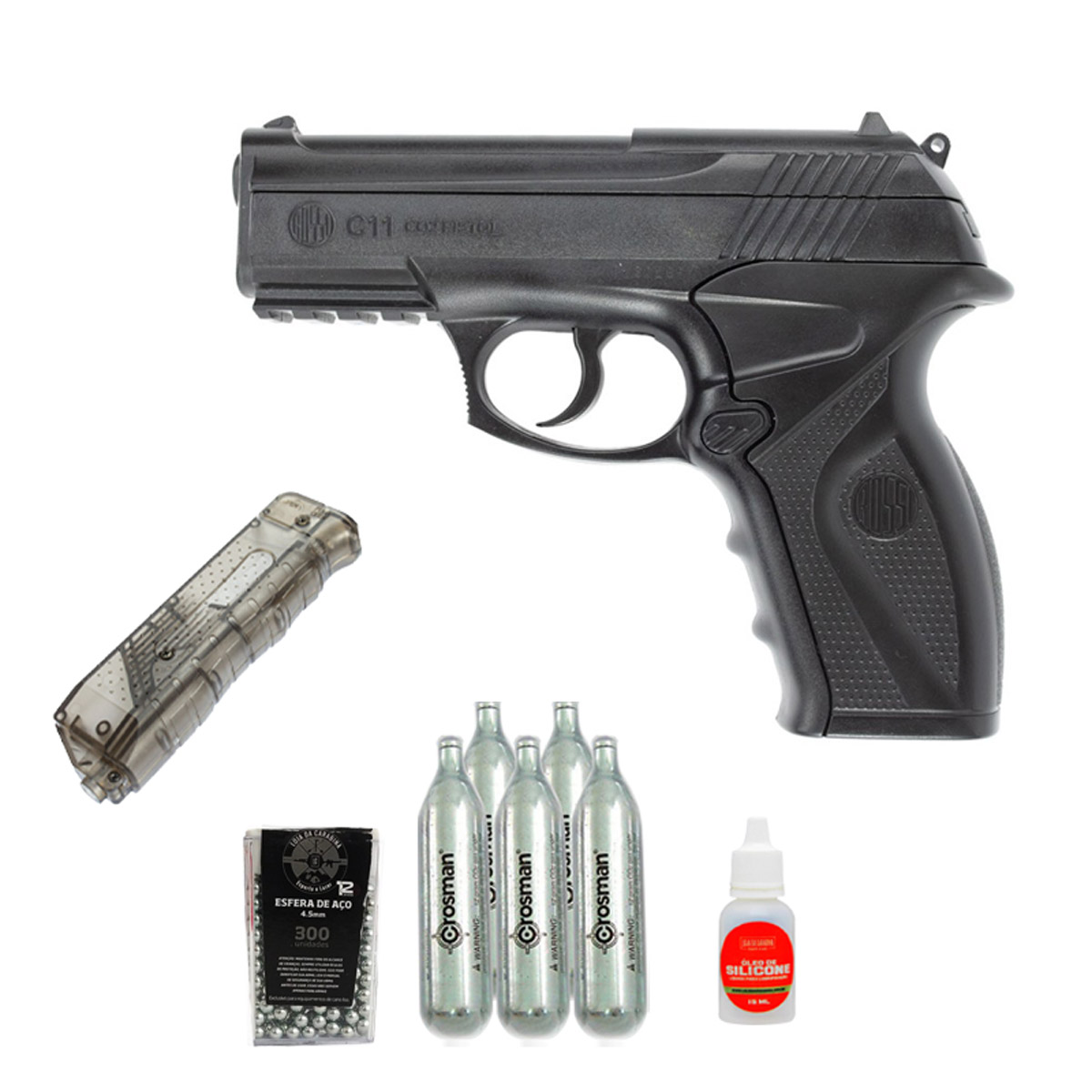 Para maior segurança e praticidade do atirador a C11 conta com uma trava de gatilho de fácil acesso, magazine com capacidade para 17 esferas de aço no calibre 4.5mm e trilho tático de 20mm para lanternas e acessórios