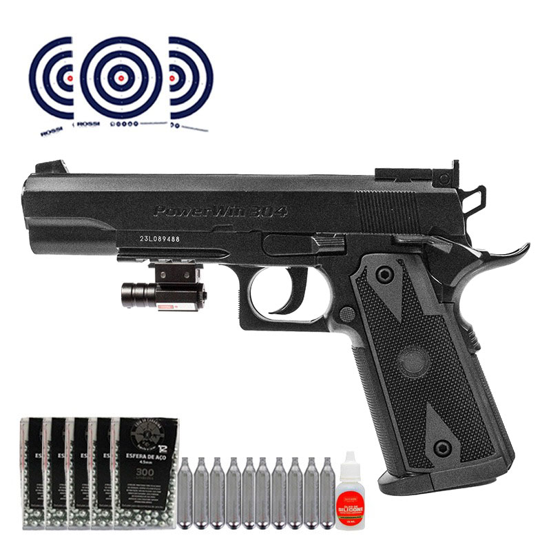 KIT completo, acompanha Esferas de Aço 4.5mm LojaDaCarabina para municiar sua pistola, Mira Laser para facilitar a visada do trajeto do tiro, Cilindro de CO2 12g para impulsionar seus disparos e Alvos de Treino Rossi.