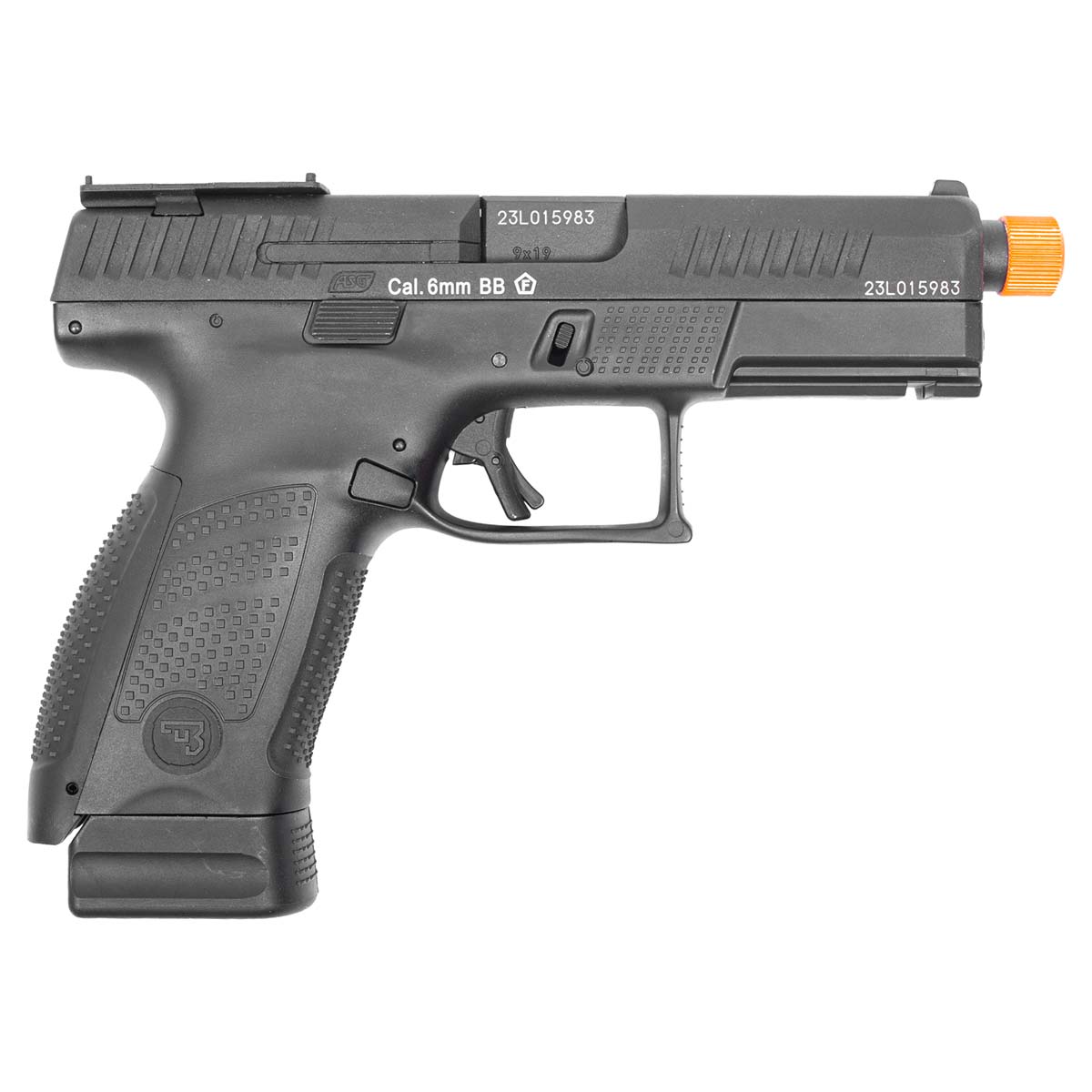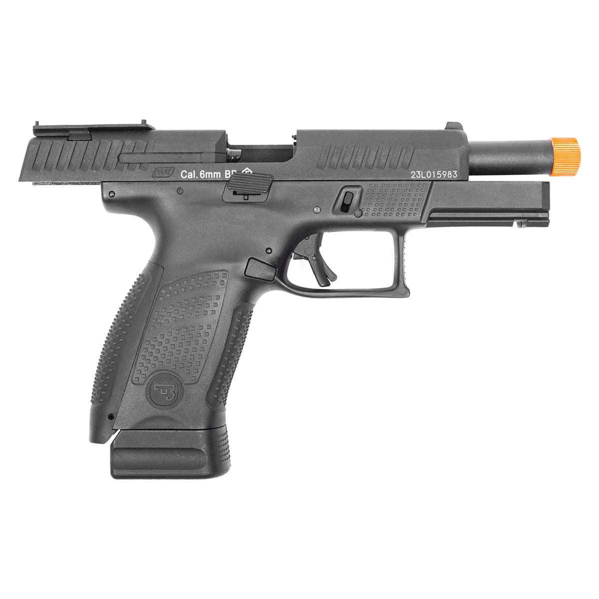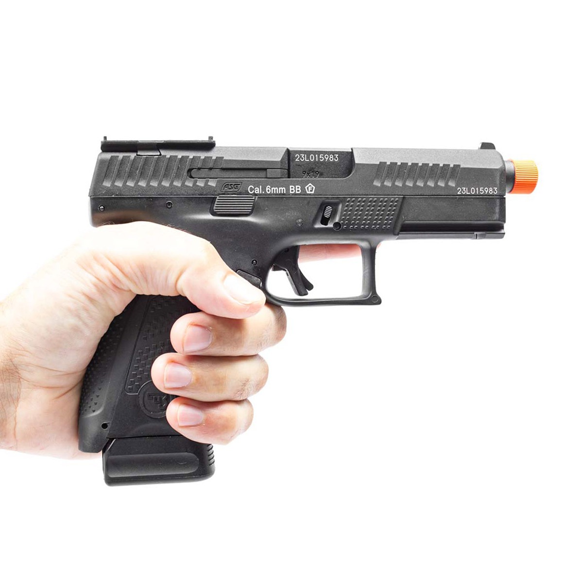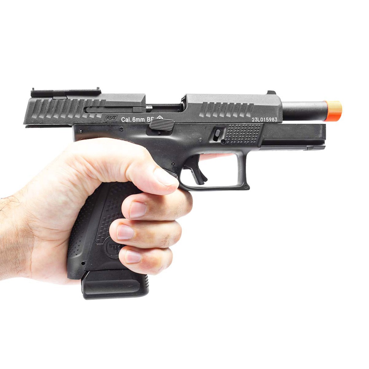 A construção combina slide metálico em alumínio com corpo em polímero reforçado, garantindo resistência, leveza e excelente equilíbrio. As marcações oficiais CZ estão presentes no slide, frame e magazine, reforçando o alto nível de realismo.