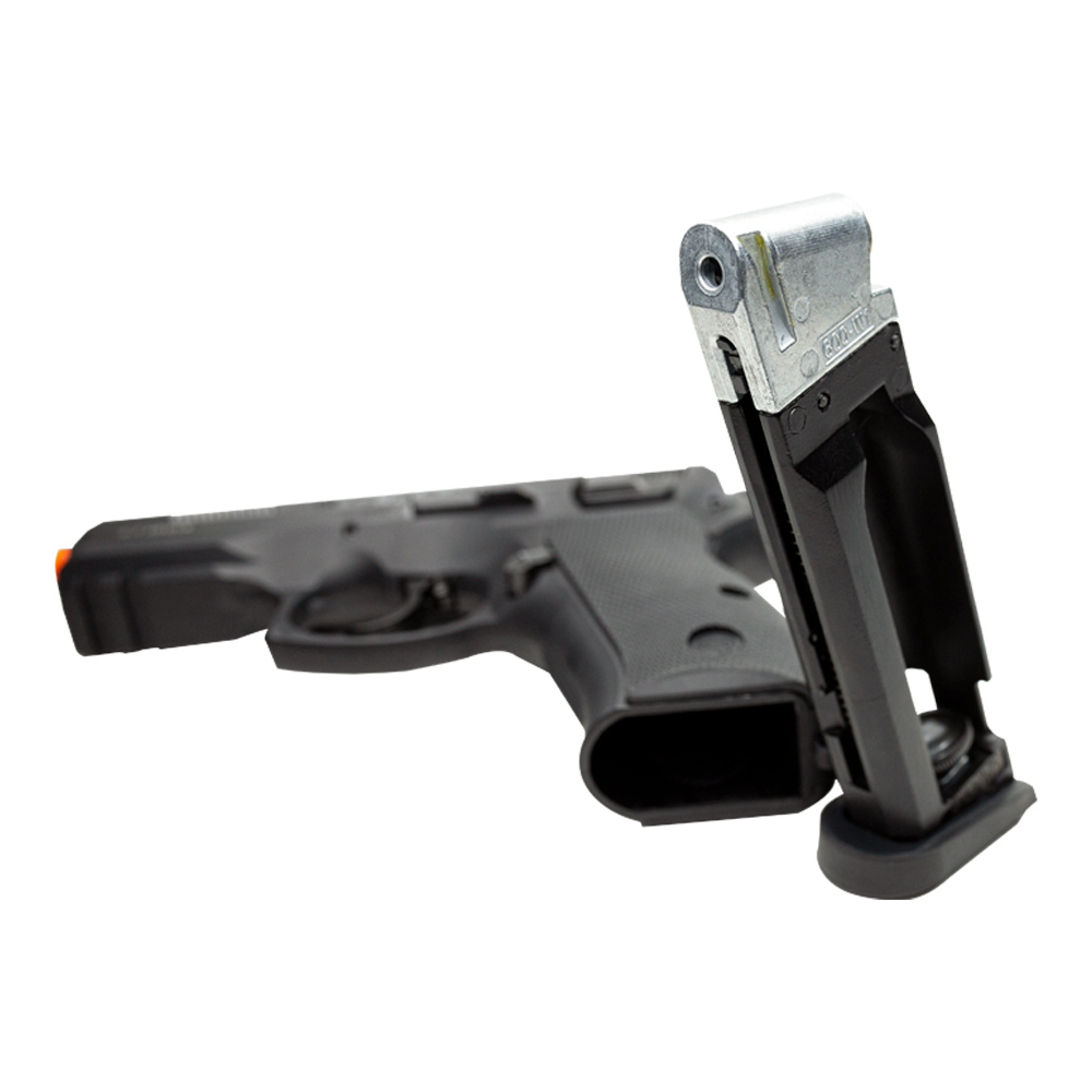 O modelo utiliza magazine metálico com capacidade para 25 BBs, garantindo boa autonomia em jogo, além de ser compatível tanto com CO2 quanto com gás, oferecendo maior flexibilidade de uso.