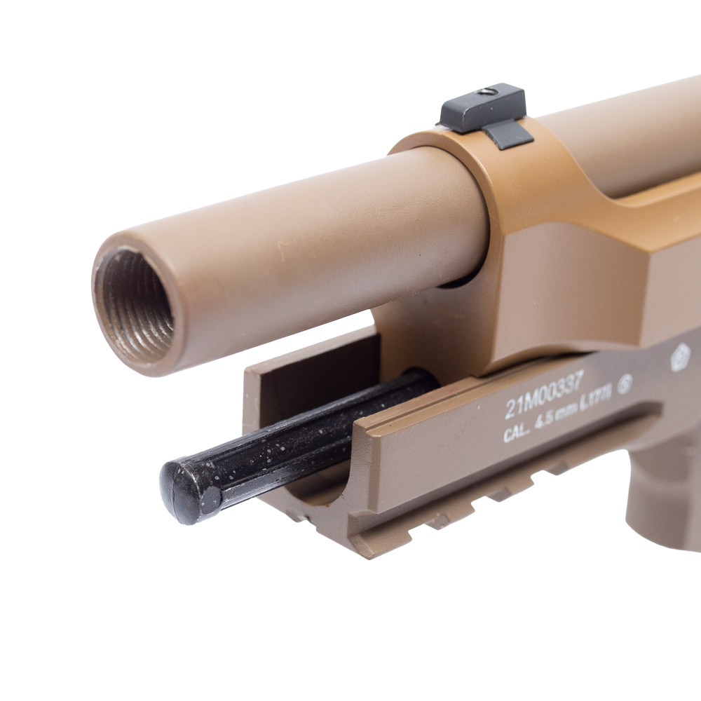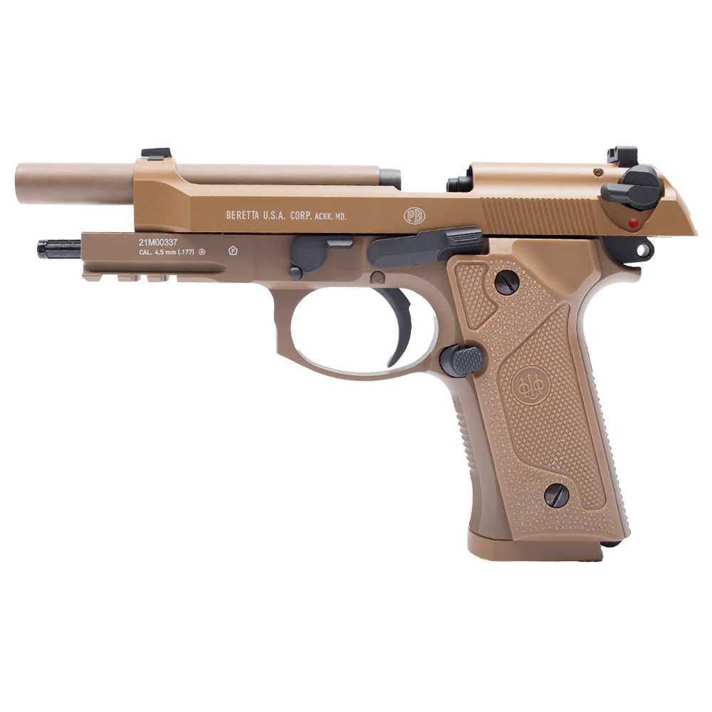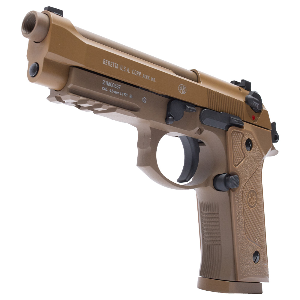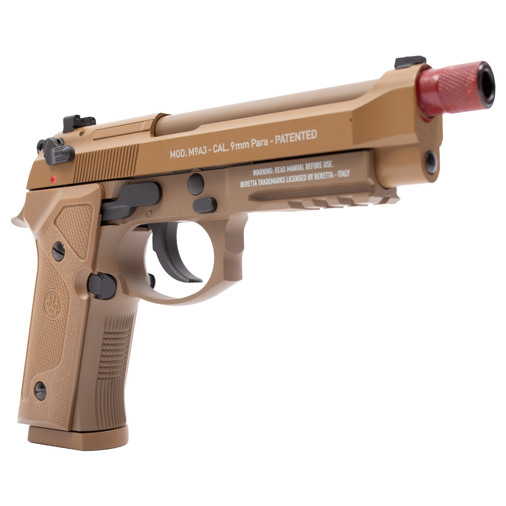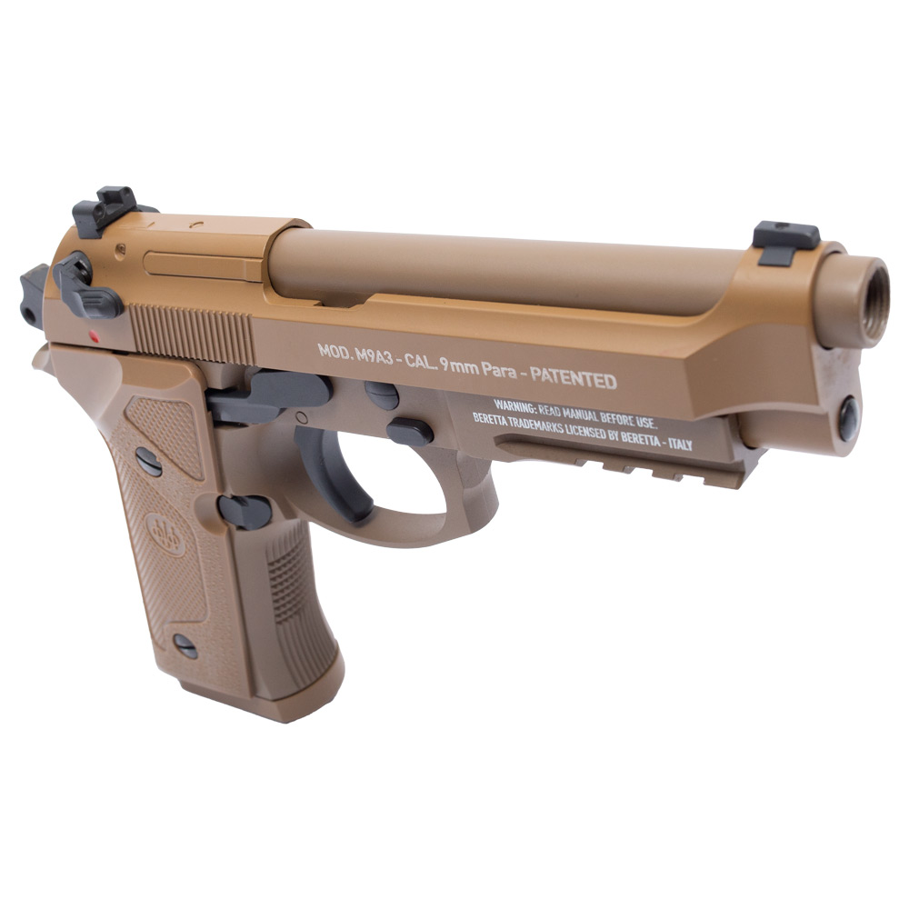 Réplica licenciada e com marcações originais em escala 1:1 Beretta M9A3. A Pistola de Pressão M9A3 by Umarex, tem ação simples e dupla com sistema de propulsão por cilindro co2 12g.