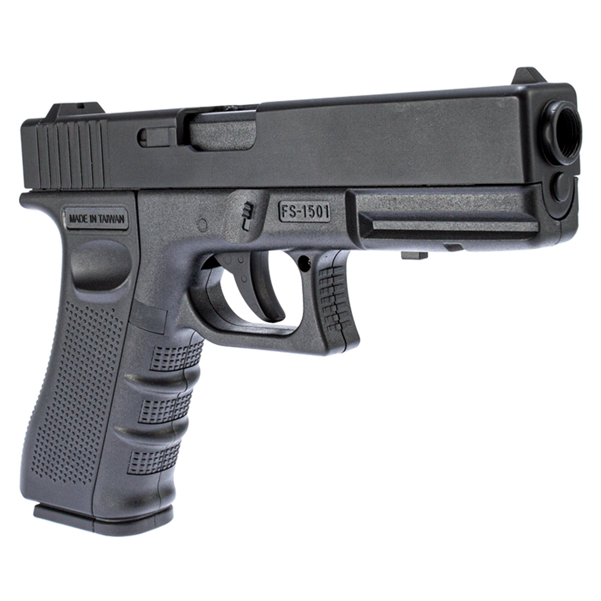 Assim como na Pistola Glock de fogo, possui slide em metal e corpo em polímero.