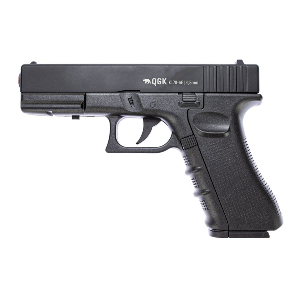 Pistola de pressão modelo Glock Co2 K17 QGK no calibre 4.5 mm (.177), fabricada em metal na cor preta.