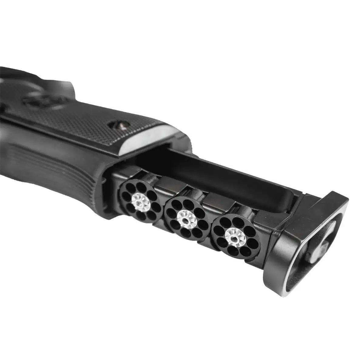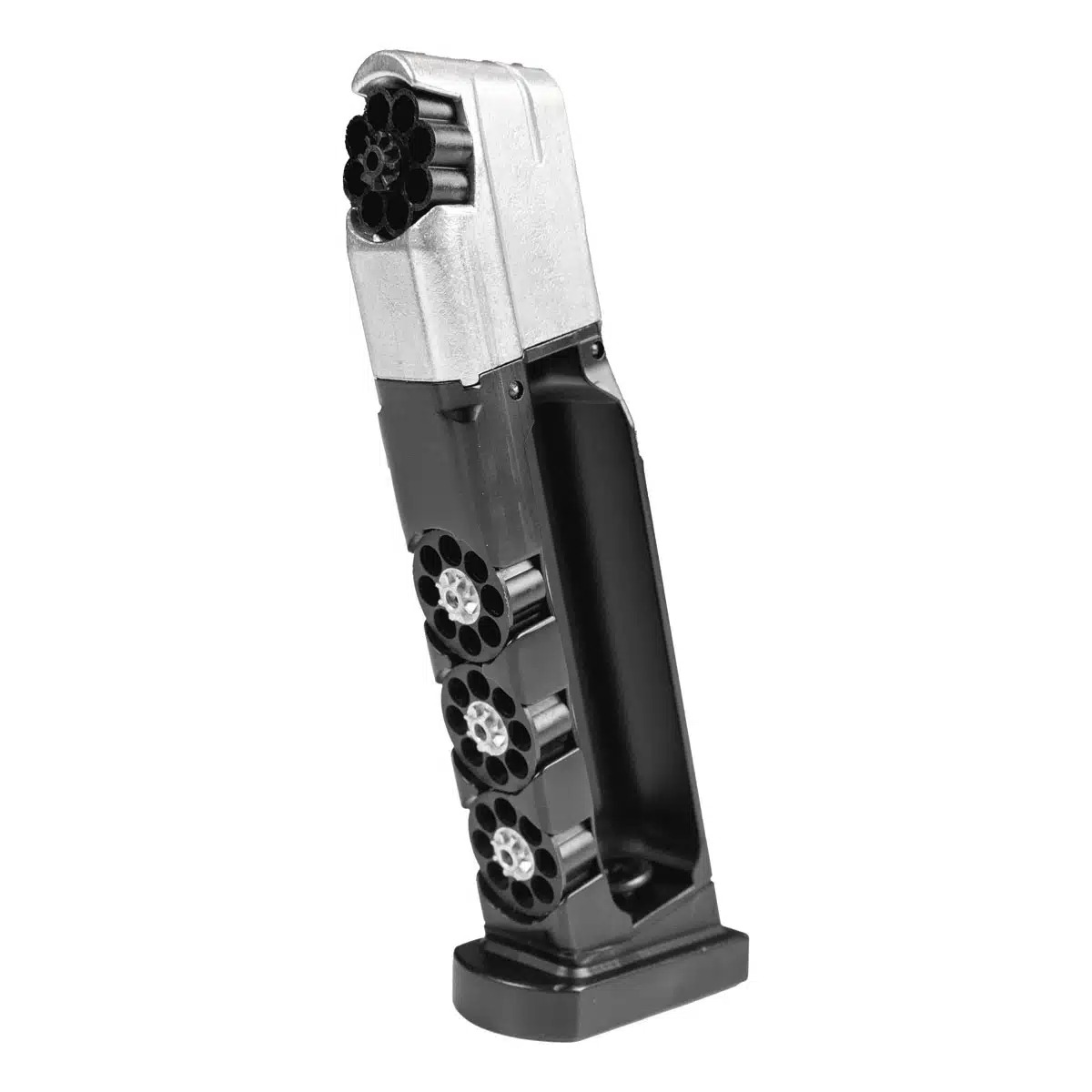 Essa pistola tem um magazine de alta capacidade que consiste em um único magazine que possui 4 tambores rotativos integrados onde você poderá inserir suas munições, sendo elas chumbinhos 4.5 mm ou esferas de aço. Ao total, serão 32 disparos, ou seja, muitos tiros para você treinar, competir, praticar ou se divertir com toda praticidade sem precisar parar o tempo todo para recarregar. É também no magazine onde você vai inserir o cilindro de co2 12g para alimentação do sistema da pistola Rossi Beretta M92 FS 2024.