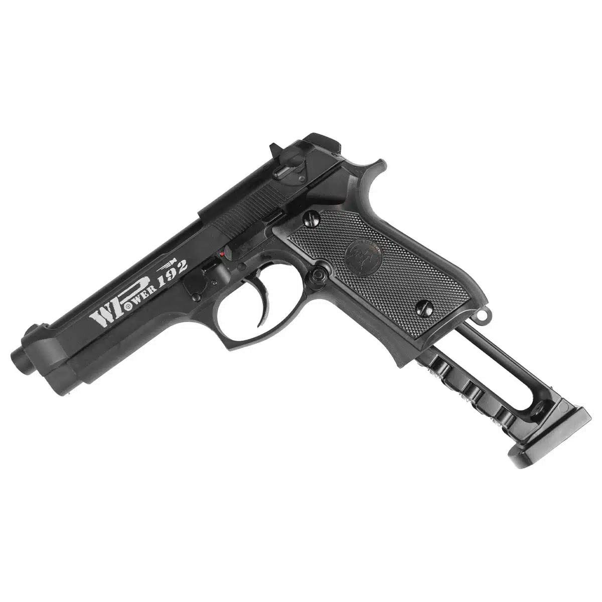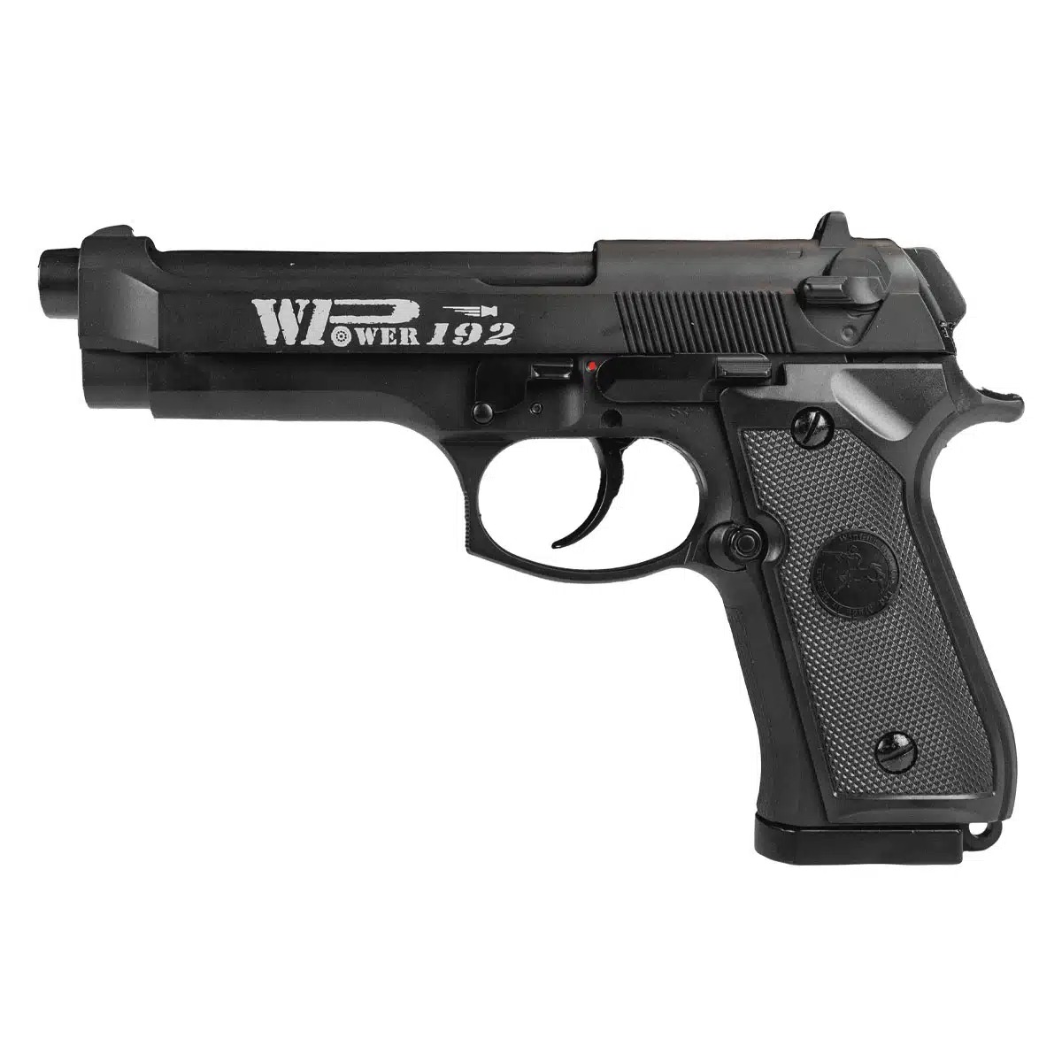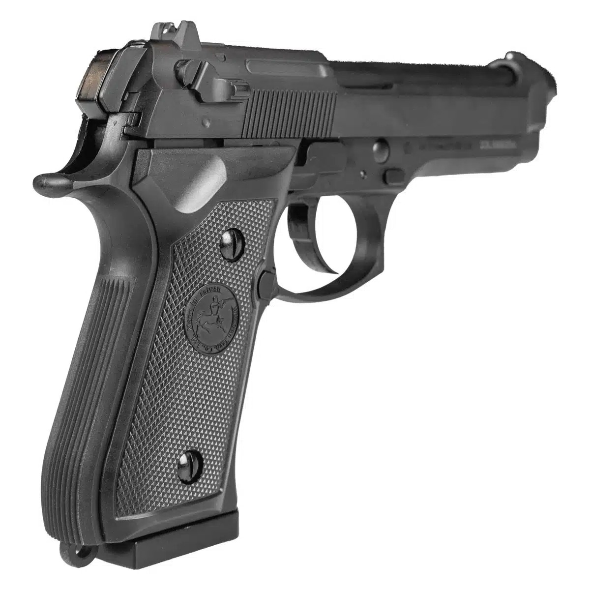 A empunhadura da Pistola Airgun Rossi M92 FS é texturizada, oferecendo uma pegada mais firme para maior estabilidade nos disparos.