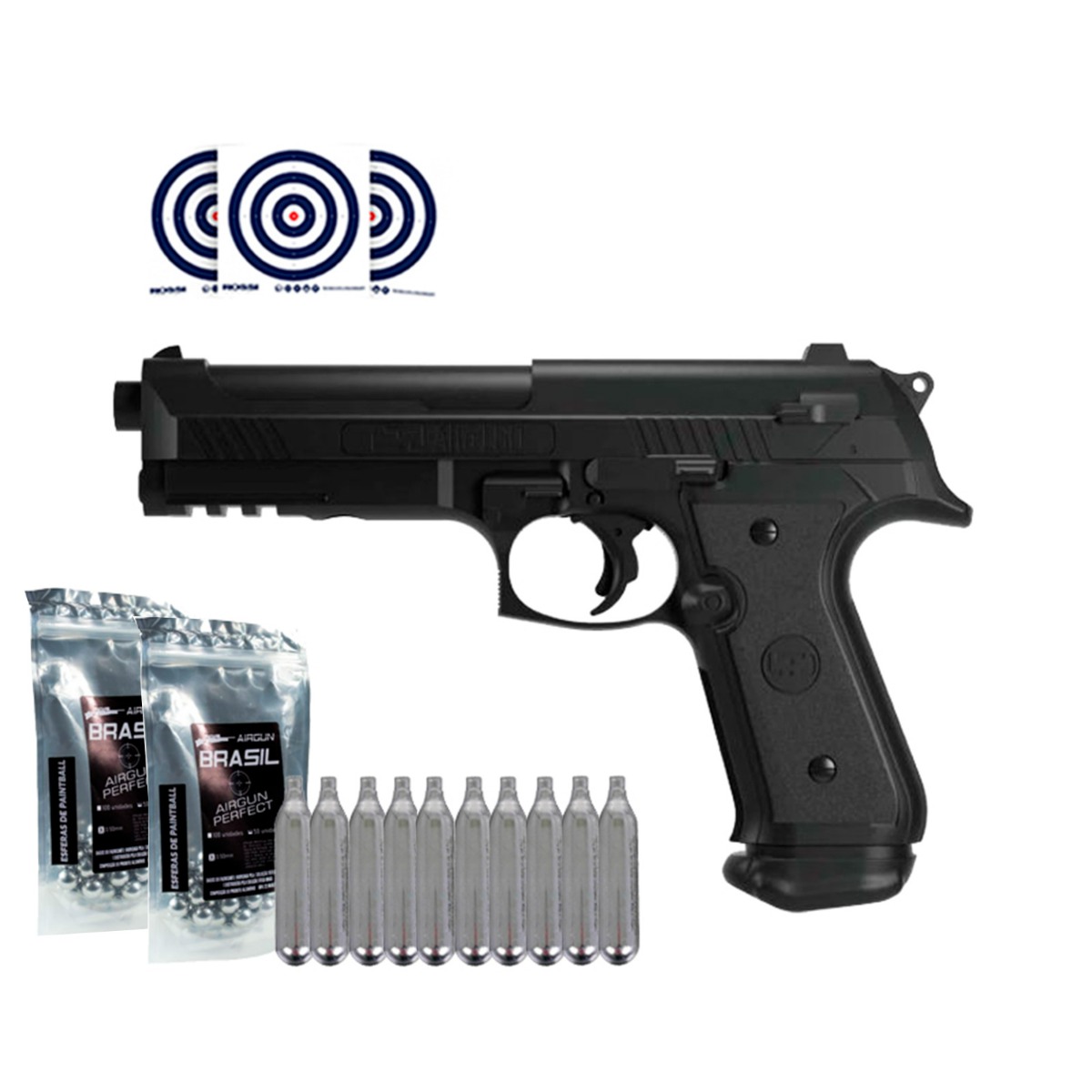 Seu design é inspirado na famosa Beretta 92. Fabricada em polímero de alta densidade na cor preta e acabamento fosco.