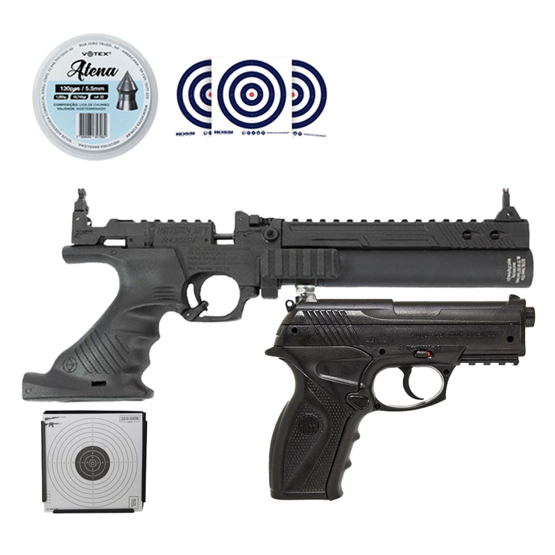 Combo completo montado pela LojaDaCarabina! Contém Pistola de CO2 C11 Rossi como uma alternativa para seus disparos, Chumbinhos Votex Atena para municiar seus equipamentos, Alvo coletor para melhorar a eficiência do seu treino e Alvos de Treino Rossi.
