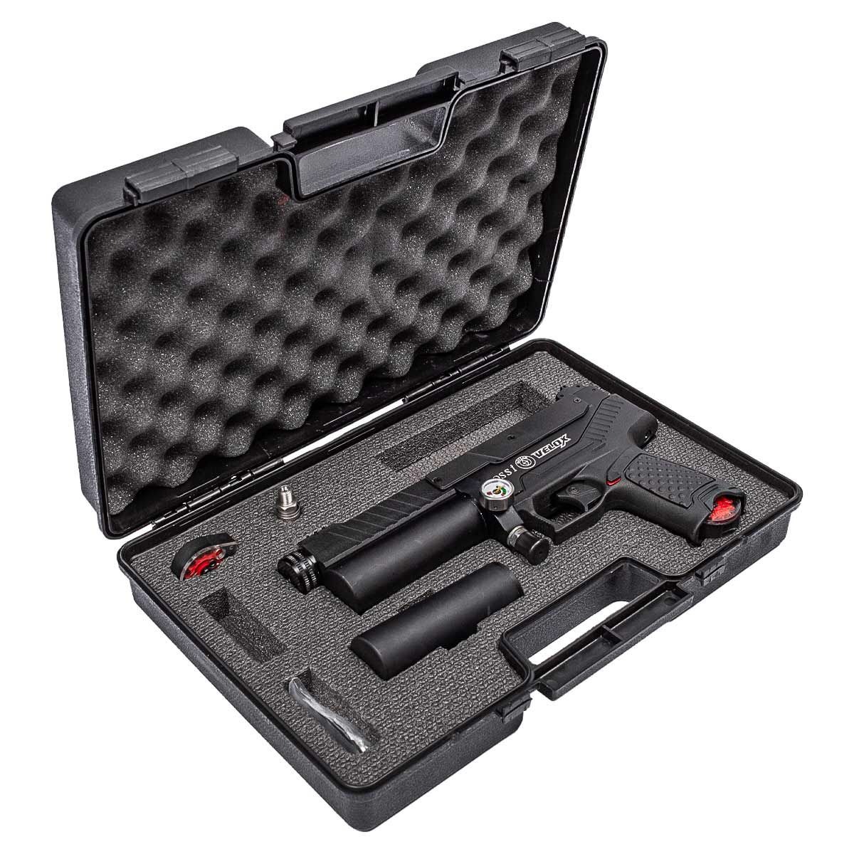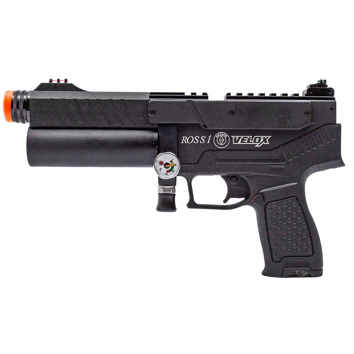 Fabricada em polímero avançado, a Velox possui cano estriado e blindado de 140 mm, manômetro lateral integrado, bico de enchimento Foster, trava de segurança manual, gatilho aprimorado e design ergonômico, proporcionando conforto e controle durante o uso. Conta ainda com trilho superior 11 mm e 20 mm picatinny, possibilitando a instalação de miras ópticas, além de acompanhar dois magazines rotativos de 10 chumbinhos e case rígido personalizado Hatsan para transporte e armazenamento seguros.