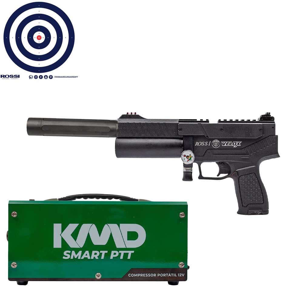 Este combo prático reúne uma pistola PCP de alto desempenho, solução de recarga profissional, supressor para maior conforto sonoro e material para treino. A Pistola PCP Hatsan Velox 5.5 mm apresenta cilindro de ar removível de 55 cc com autonomia média de 20 disparos, pressão de trabalho até 250 BAR, velocidade média de 188 m/s (≈620 fps) e energia aproximada de 17 J; conta com cano estriado de 140 mm, gatilho aprimorado, dois magazines rotativos para 12 chumbinhos, alça de mira ajustável com fibra óptica verde, massa de mira com fibra óptica vermelha, slot para magazine sobressalente, trava de segurança manual, rosca UNF 1/2" para uso de supressor e trilhos superiores em 11 mm e 20 mm para instalação de miras e acessórios, tudo em corpo ergonômico de polímero com case rígido personalizado incluso. O Compressor de AR KMD trabalha até 300 BAR, com potência de 350 W, refrigeração por ventilação, função bivolt e compatibilidade com 12 V, manômetro e mangueira de alta pressão, sendo ideal para recargas rápidas e seguras em casa ou em campo. O Supressor R8 em alumínio anodizado oferece acabamento resistente e redução do ruído do disparo quando instalado na rosca adequada. Para treino, o kit inclui 30 alvos descartáveis 14x14 cm com ponto central para aperfeiçoamento de mira. Conjunto indicado para atiradores que buscam praticidade, recarga eficiente e uma solução pronta para treino e uso responsável; envio para todo o Brasil e nota fiscal inclusa.