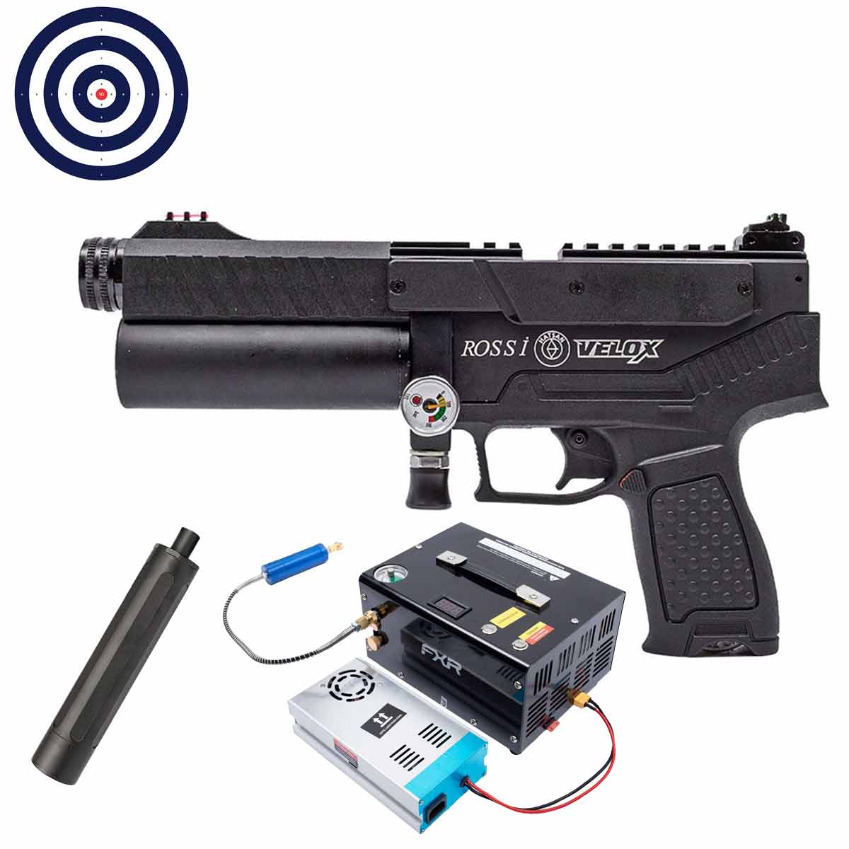 O compressor portátil incluído torna o enchimento do cilindro simples e ágil, eliminando o esforço da bomba manual e aumentando sua autonomia de uso. O supressor R8 reduz o ruído do disparo e melhora a experiência em treinos e em ambientes onde é desejável menor assinatura sonora. Para completar, o kit traz 30 alvos descartáveis Rossi, ideais para treino de precisão e diversão imediata. Este conjunto é perfeito para atiradores que buscam um pacote pronto para uso, com foco em conforto, desempenho e conveniência.