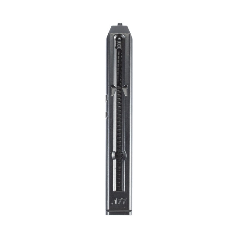 Seu magazine é em metal e tem capacidade para até 14 esferas de aço 6.0mm.