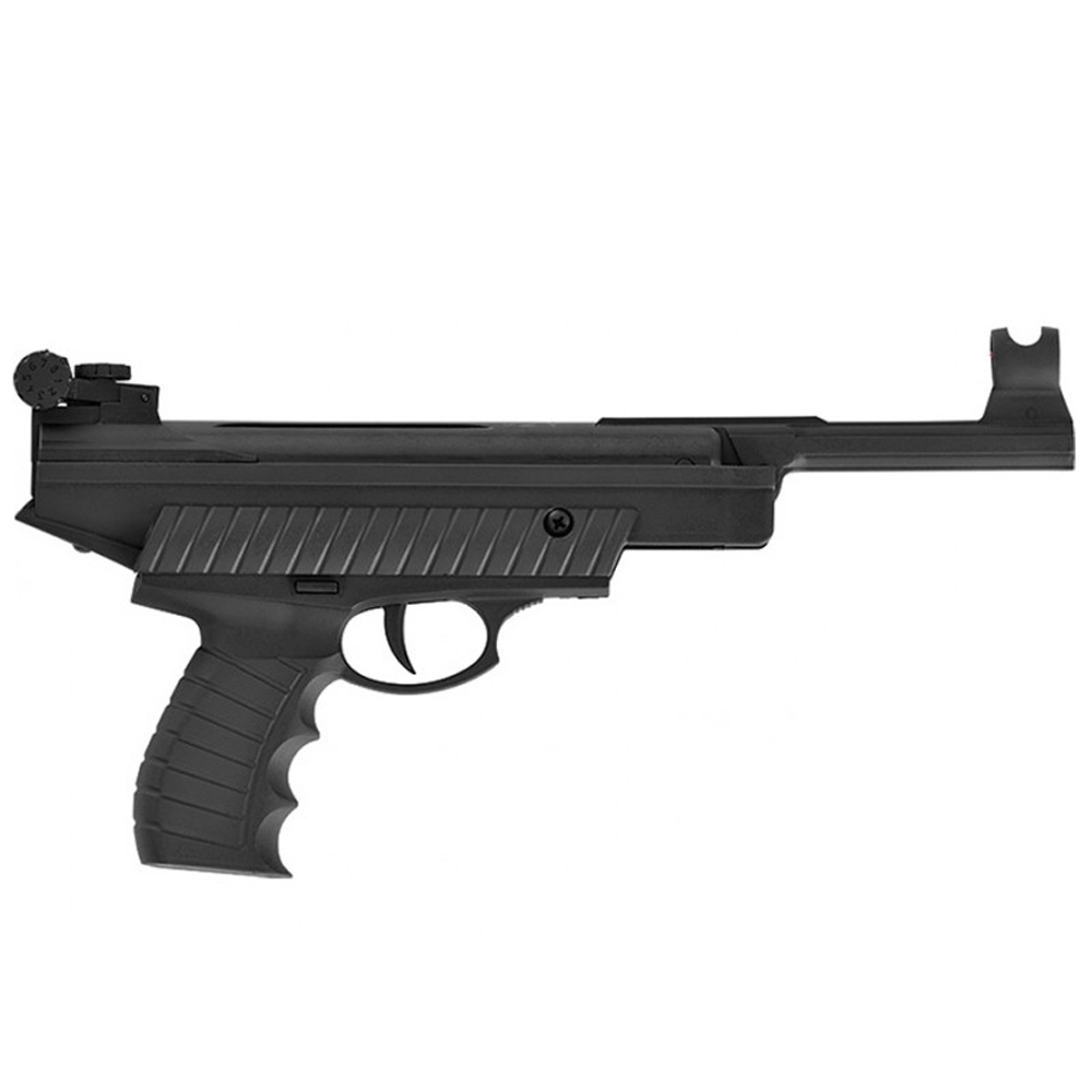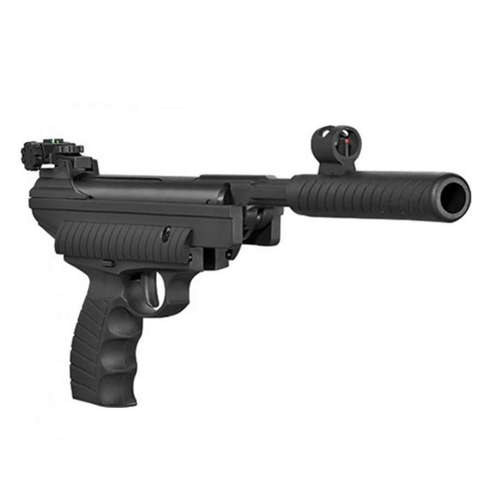 Extensor do cano para facilitar o engatilhamento, possui onjunto de mira aberta TRUGLO com fibra óptica.