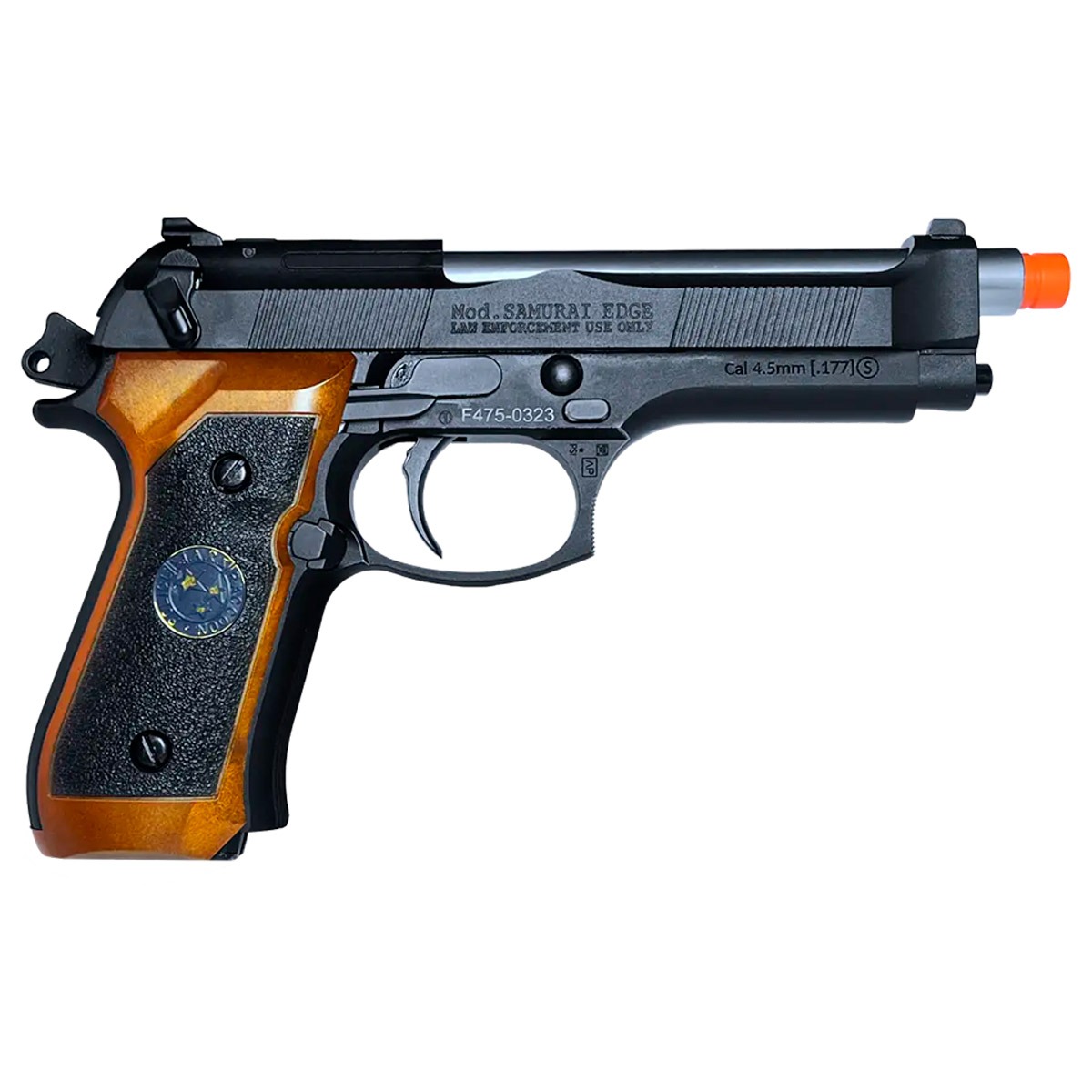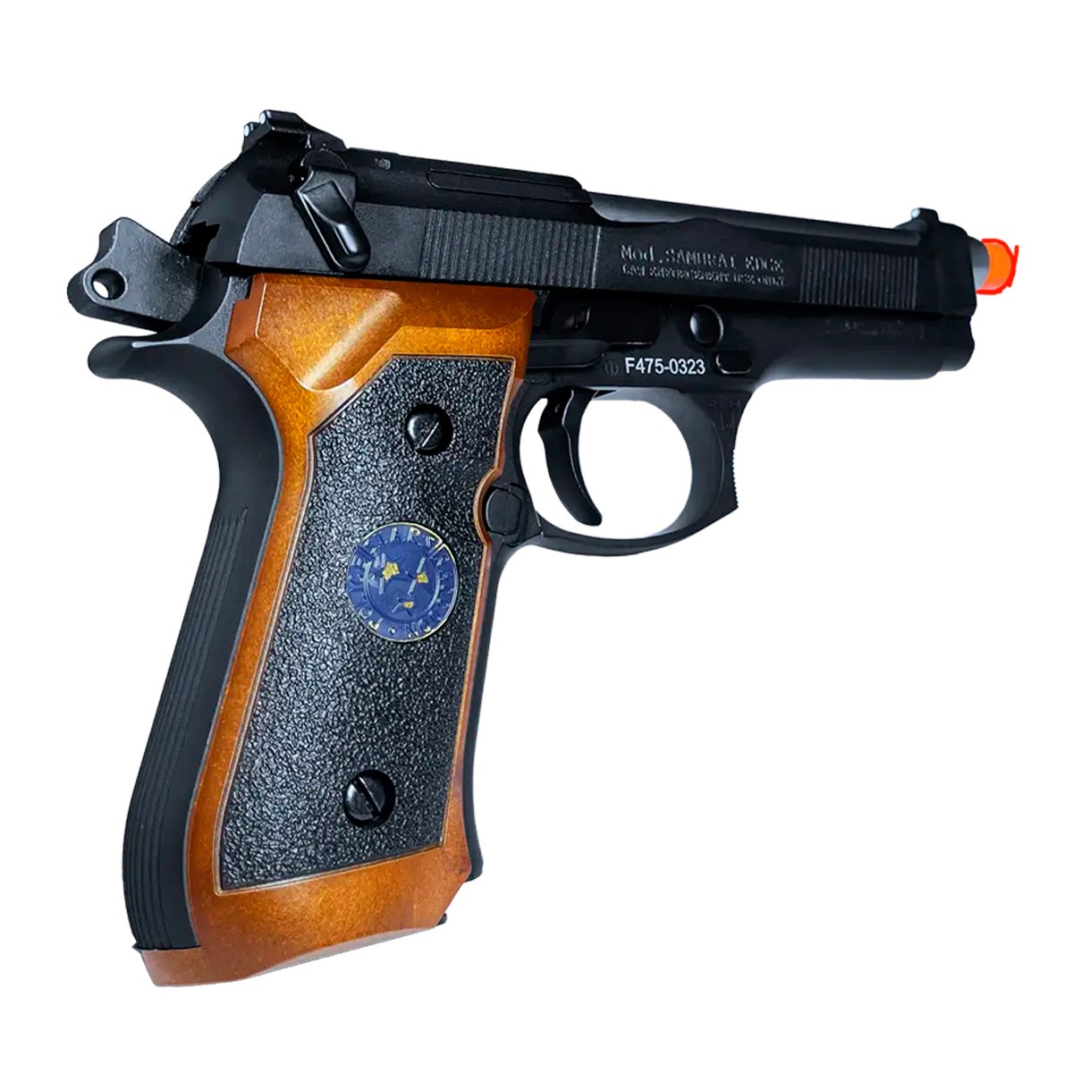 Construída em full metal, o modelo apresenta excelente qualidade estrutural, peso equilibrado e sensação realista no manuseio. Seu acabamento dual tone, com detalhes personalizados no grip, remete diretamente à clássica Samurai Edge, tornando-a uma peça diferenciada tanto para uso recreativo quanto para colecionismo.