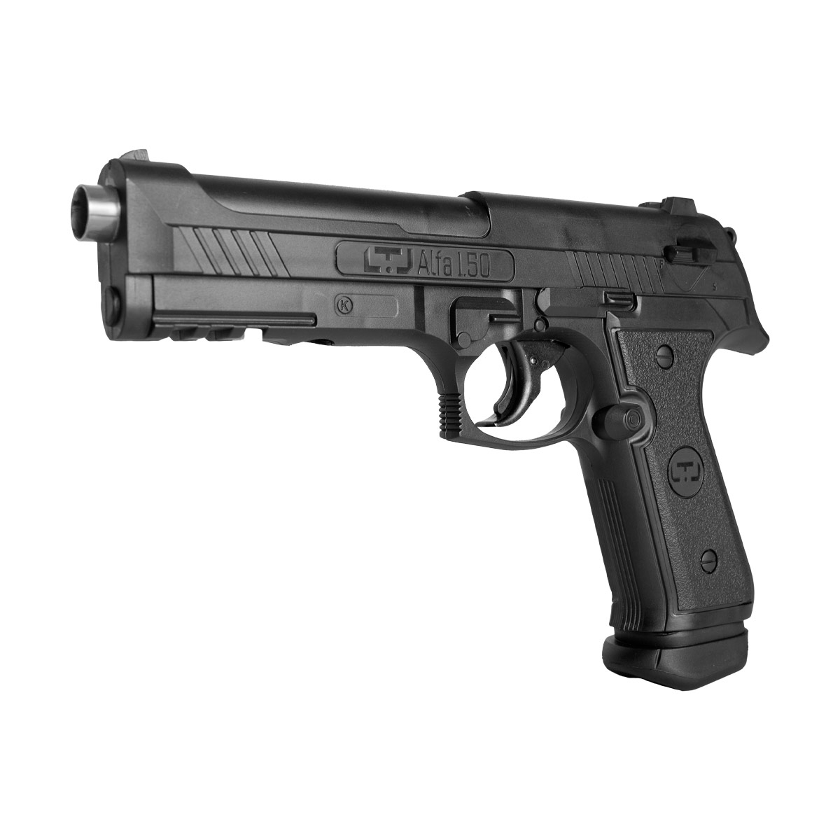 A Pistola LTL Alpha dispara em modo semiautomático e pesa 400 gramas. Tem um comprimento total de 24.5 cm.