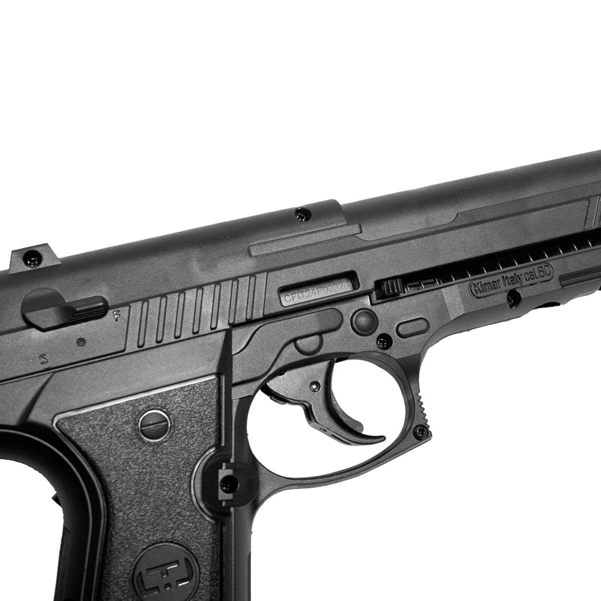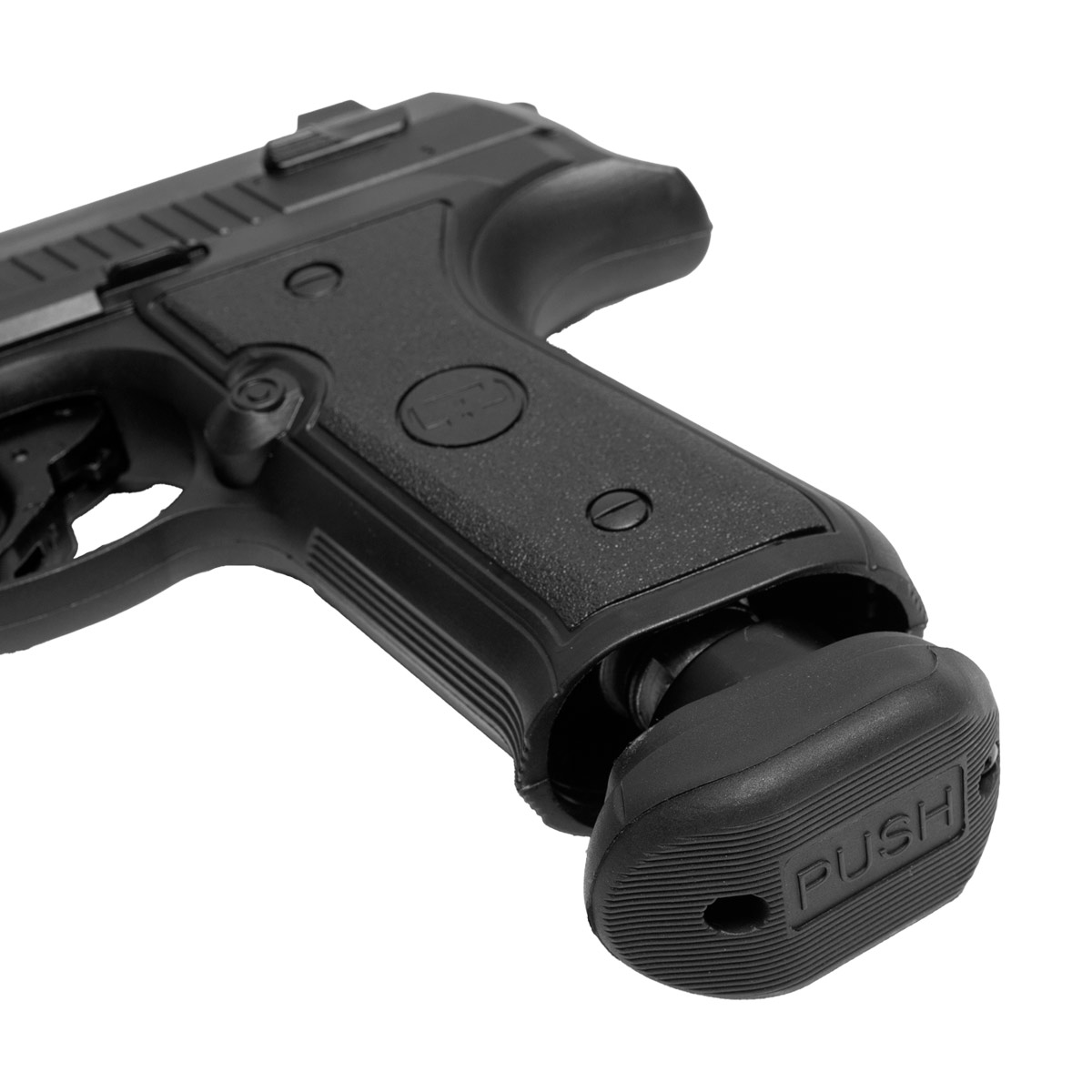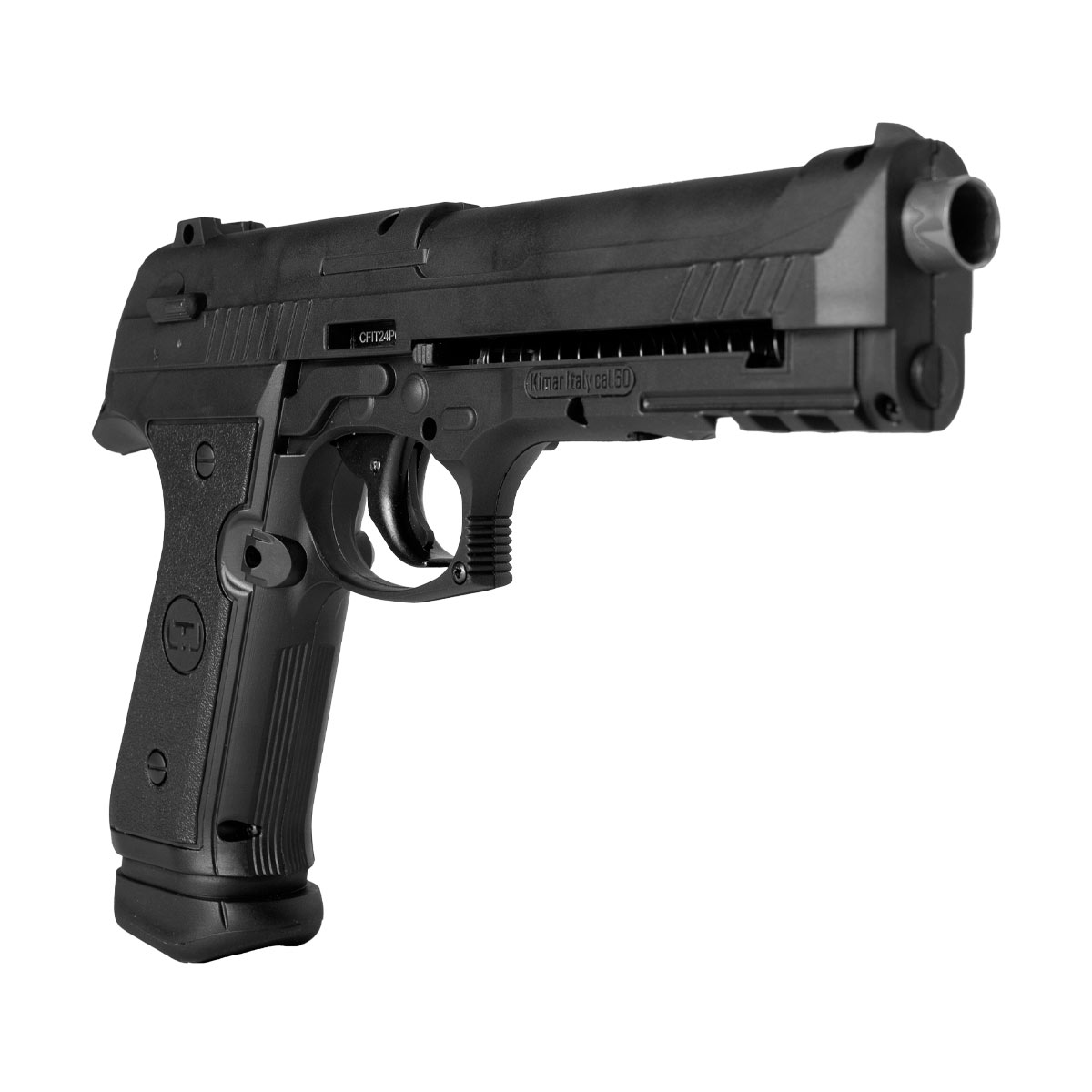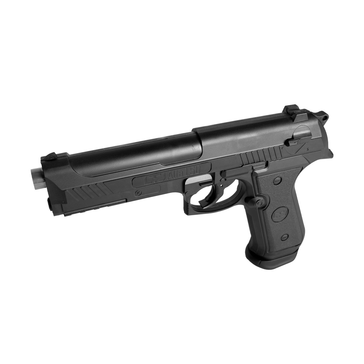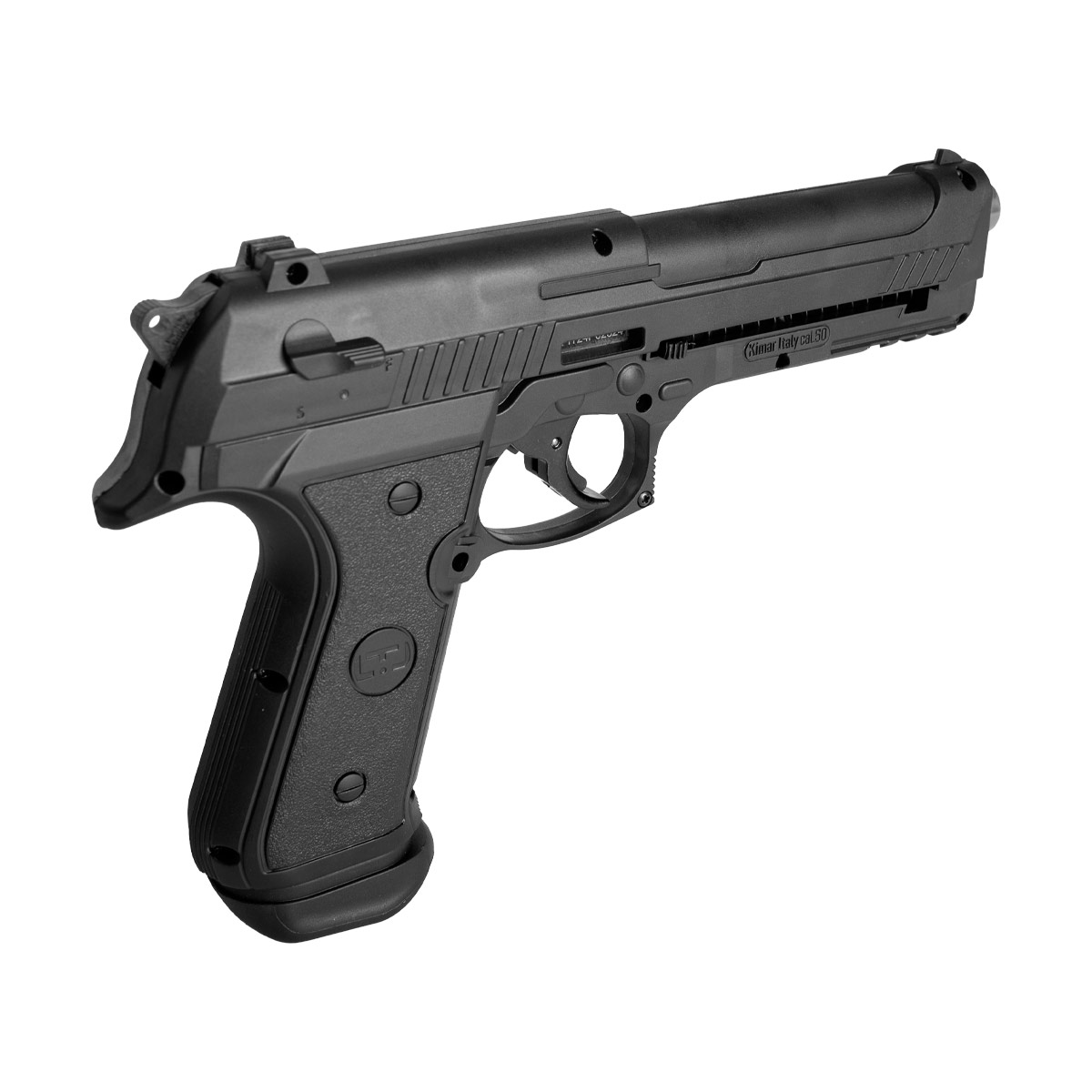 Seu design é inspirado na famosa Beretta 92. Fabricada em polímero de alta densidade na cor preta e acabamento fosco.