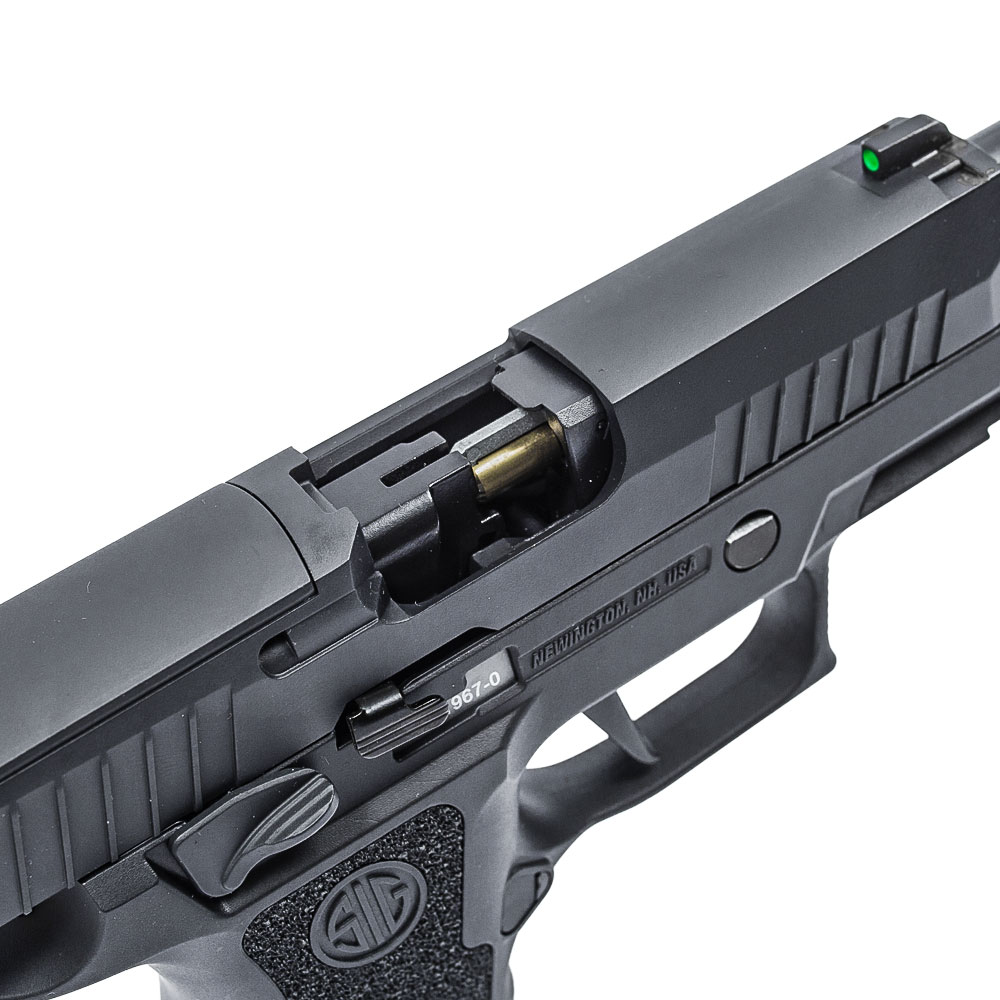 Desde o primeiro momento, a P320 XCarry impressiona por seu realismo. O sistema Blowback funcional faz com que o ferrolho de metal recue a cada disparo, simulando o recuo e o ciclo de uma arma de fogo real. Esta ação eleva a experiência de tiro a um novo patamar de imersão.