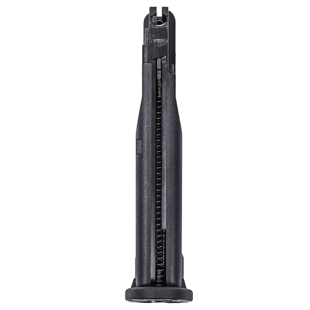 O magazine não só acomoda o cilindro de Co2 de 12g, mas também possui capacidade para 21 esferas de aço, oferecendo uma excelente autonomia antes da necessidade de recarga.