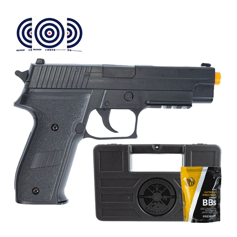 Pistola Airsoft modelo S226 fabricada pela QGK com ação por mola (spring). Ela acompanha uma Maleta Rígida para transporte e armazenamento, Airsoft BBs 0.12g para recarregar sua airsoft e Alvos de Treino Rossi.