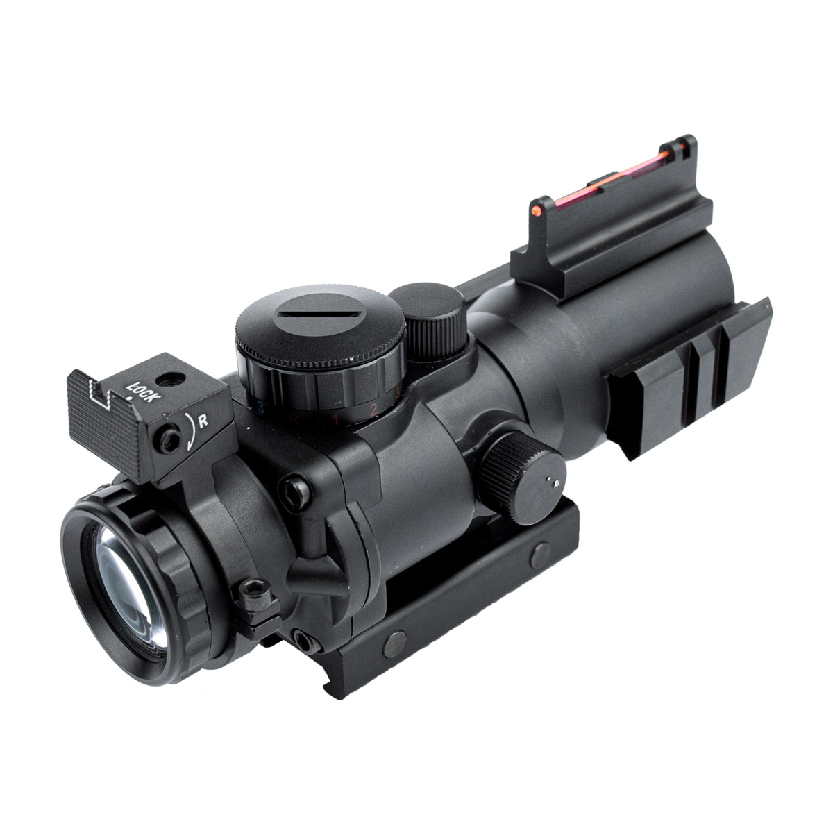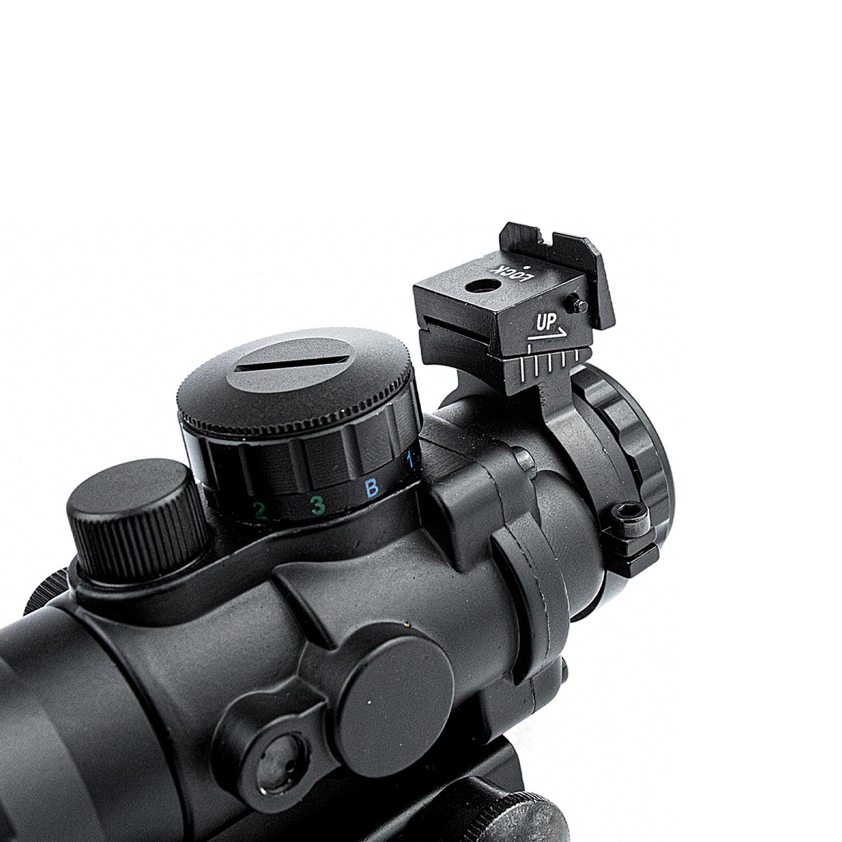 Conta com torres para ajuste vertical e horizontal da luneta. O ajuste é por click audível, com valor de 1/4MOA por click.