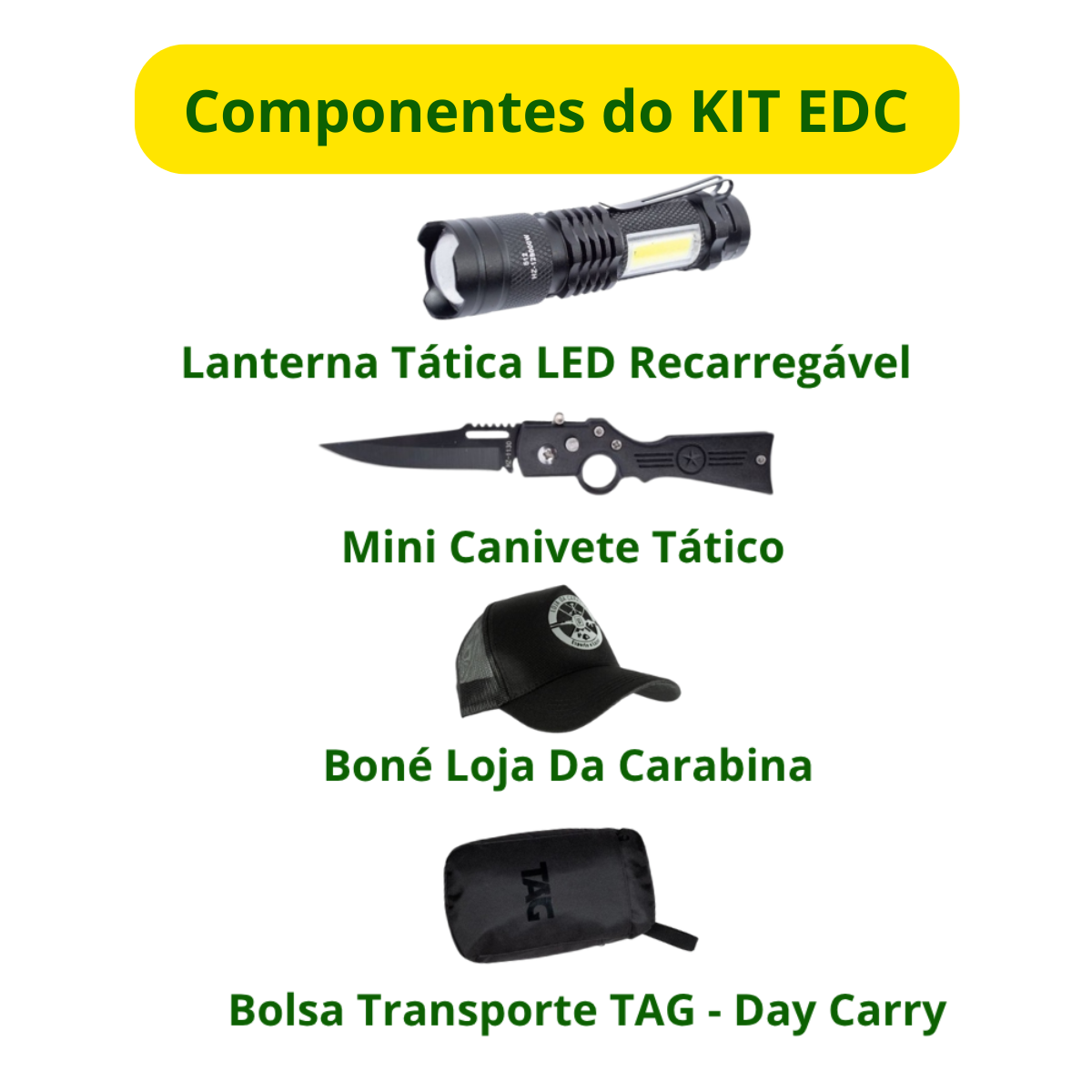 O KIT EDC que desenvolvemos contém: Boné, Bolsa TAG, Canivete e Lanterna.