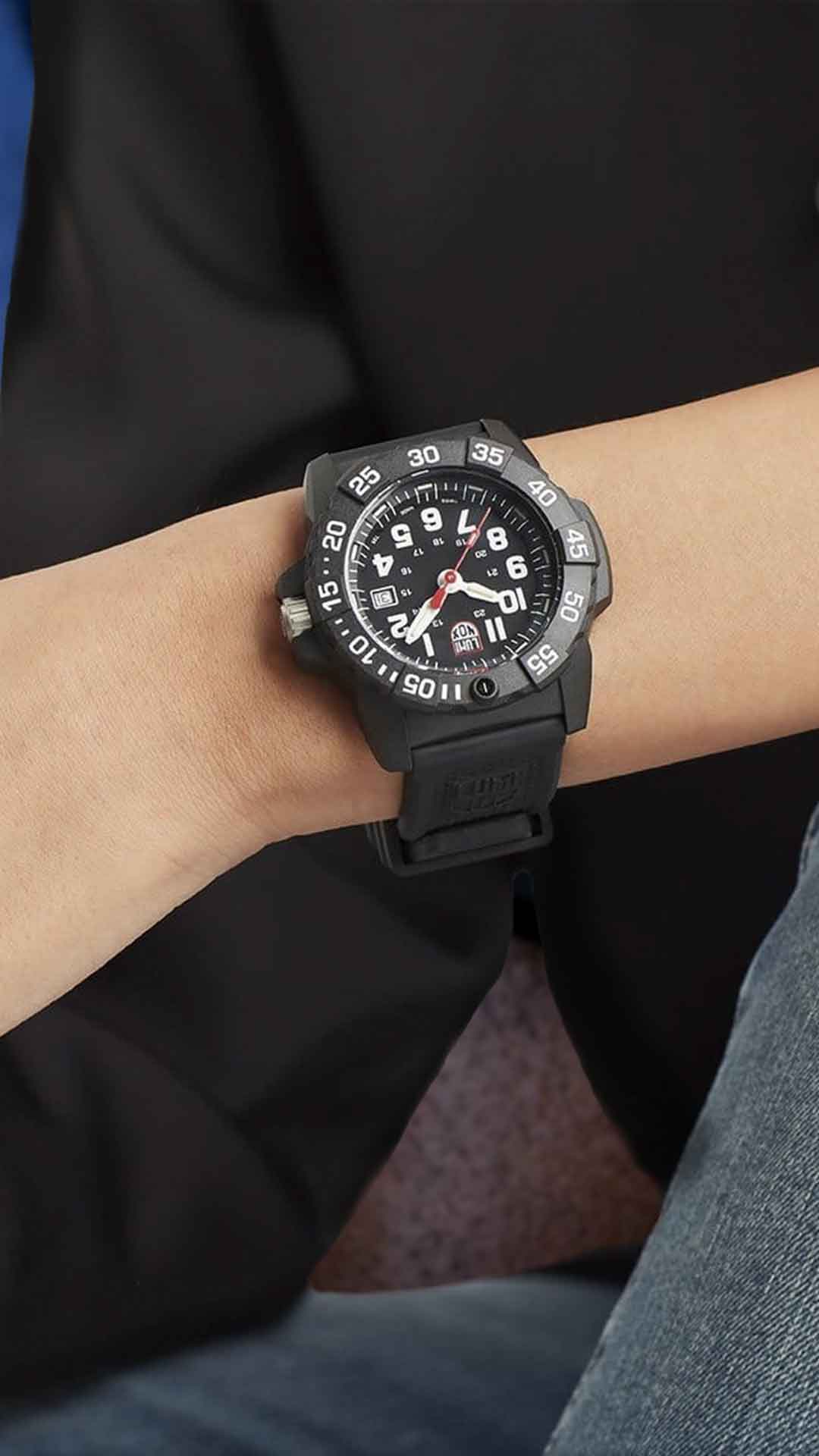 Sua caixa de 45 mm é construída em CARBONOX™, um composto de carbono exclusivo da Luminox que oferece resistência excepcional com peso reduzido. O acabamento fosco e a tonalidade escura reforçam o visual discreto e operacional, enquanto o aro giratório unidirecional permite o controle preciso do tempo em atividades subaquáticas ou cronometradas.