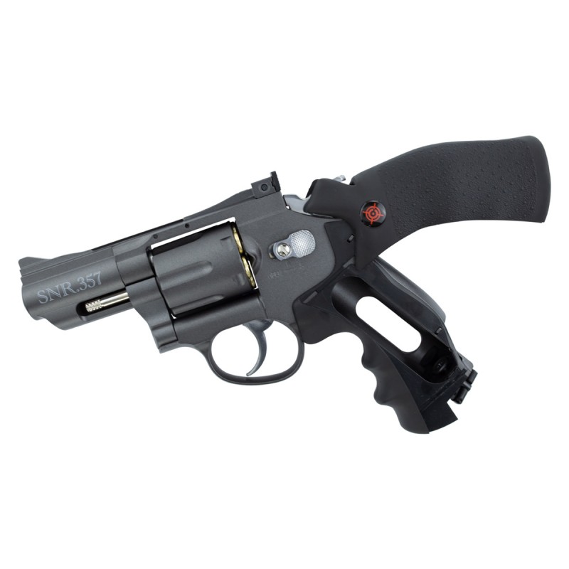 O novo Crosman SNR357 ("SNR" = Snub Nose Revolver) possui recurso duplo de munição (esferas de aço ou chumbinho 4,5mm) e carga realista com os cartuchos reutilizáveis incluídos. Corpo em Full Metal, ação dupla ou simples. Até 6 disparos, mira frontal fixa e traseira ajustável.