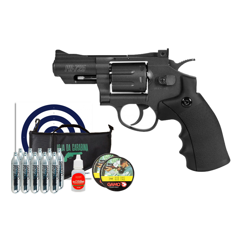 Revólver Co2 Gamo PR-725 + CHUMBINHO + CO2 GAMO + ÓLEO + CAPA + ALVO