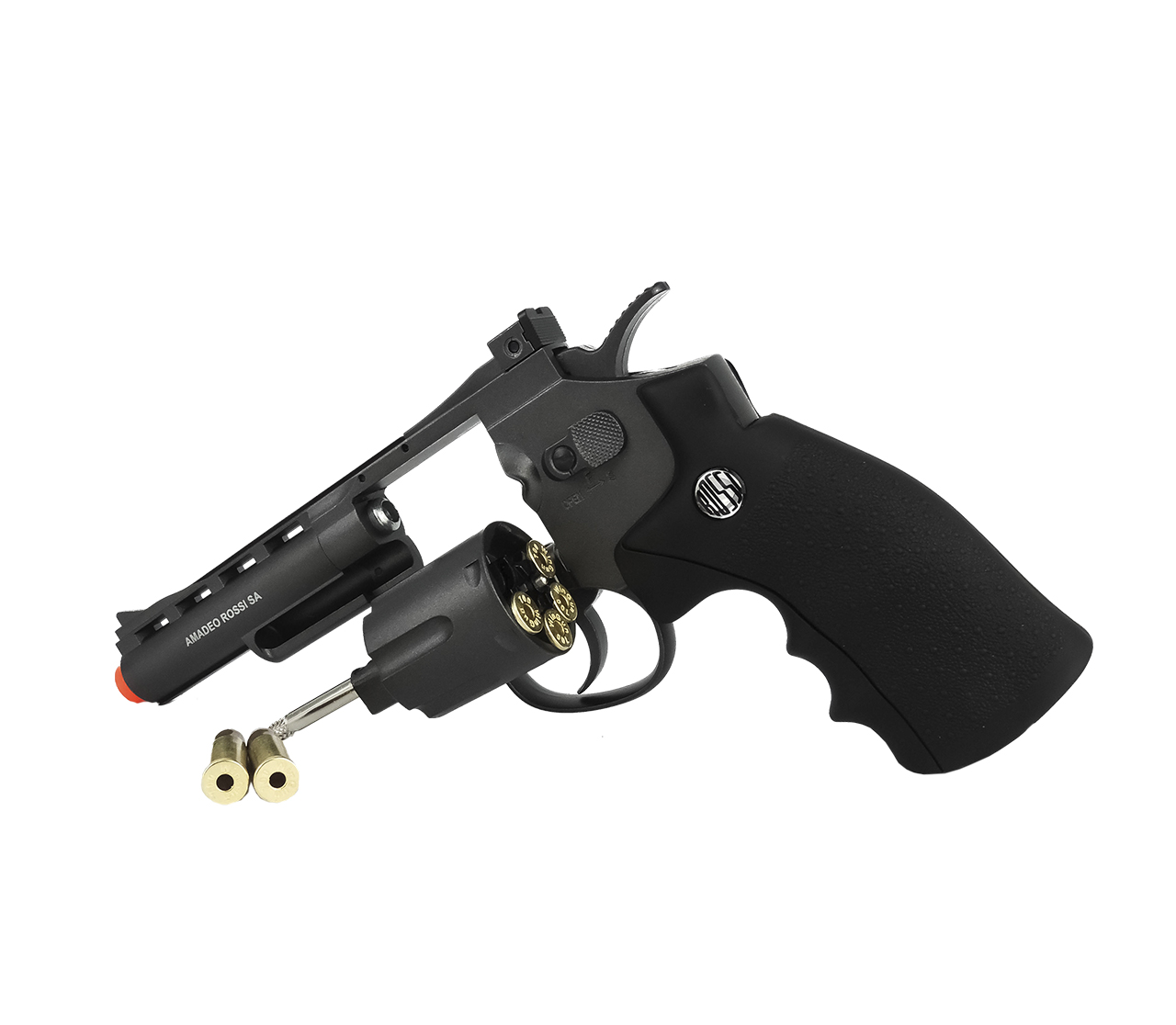 Revólver Rossi Wingun M701 com cano de 4 polegadas e alimentação por cilindro de co2 0,12g. Possui corpo em metal e punho em polímero. Acompanha cartuchos em metal para inserir as esferas de plástico no calibre 6mm e Trilhos acopláveis inferior e superior RIS medindo 4,5cm e 8,8cm.