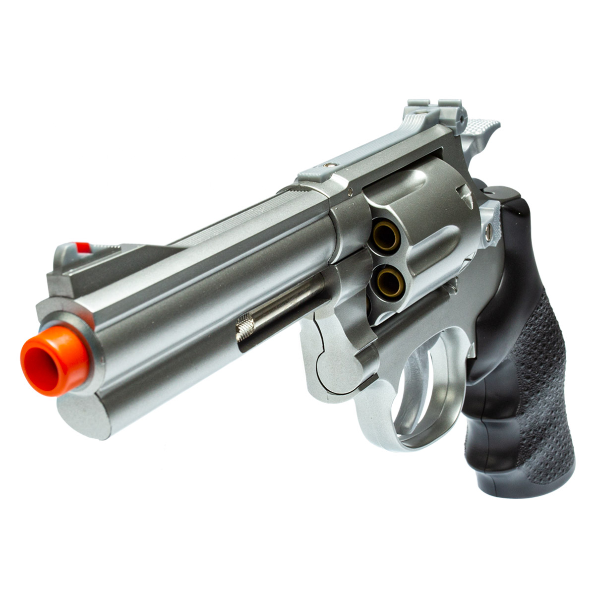 Revólver Airsoft Smith & Wesson com cano de 4 polegadas de comprimento. Já acompanha 8 cartuchos na embalagem. O tambor comporta 6 tiros por vez.Possui ponteira laranja pois se trata de um revólver airsoft. Ref.: 6594
