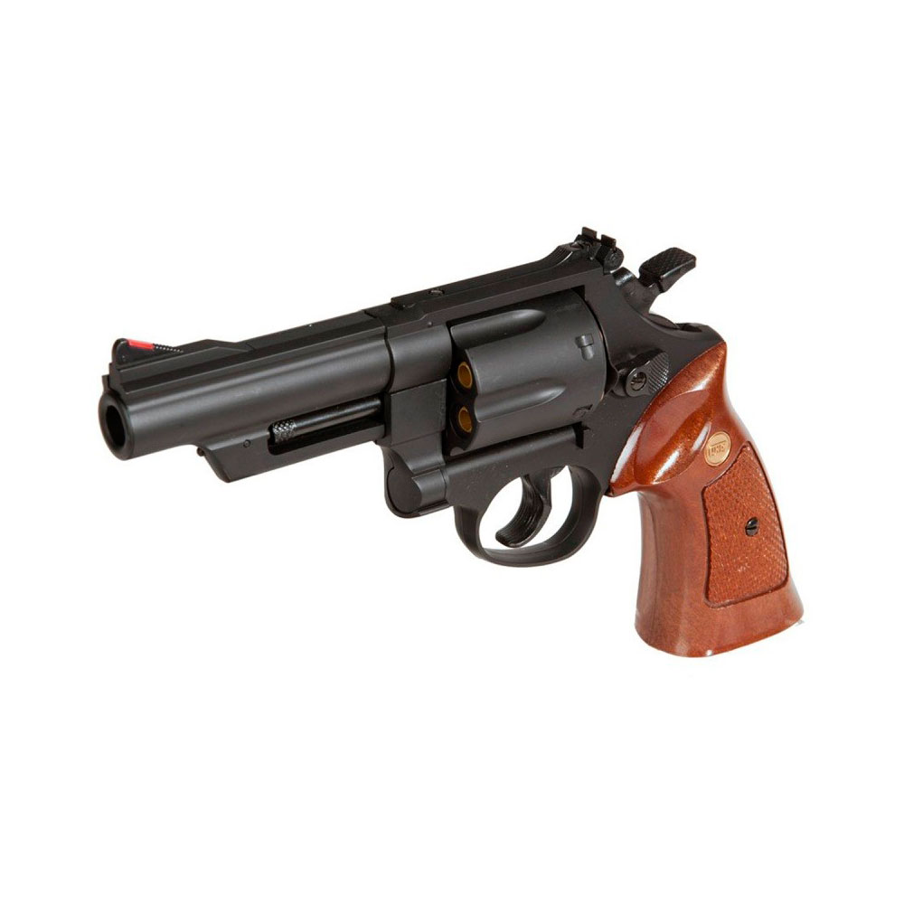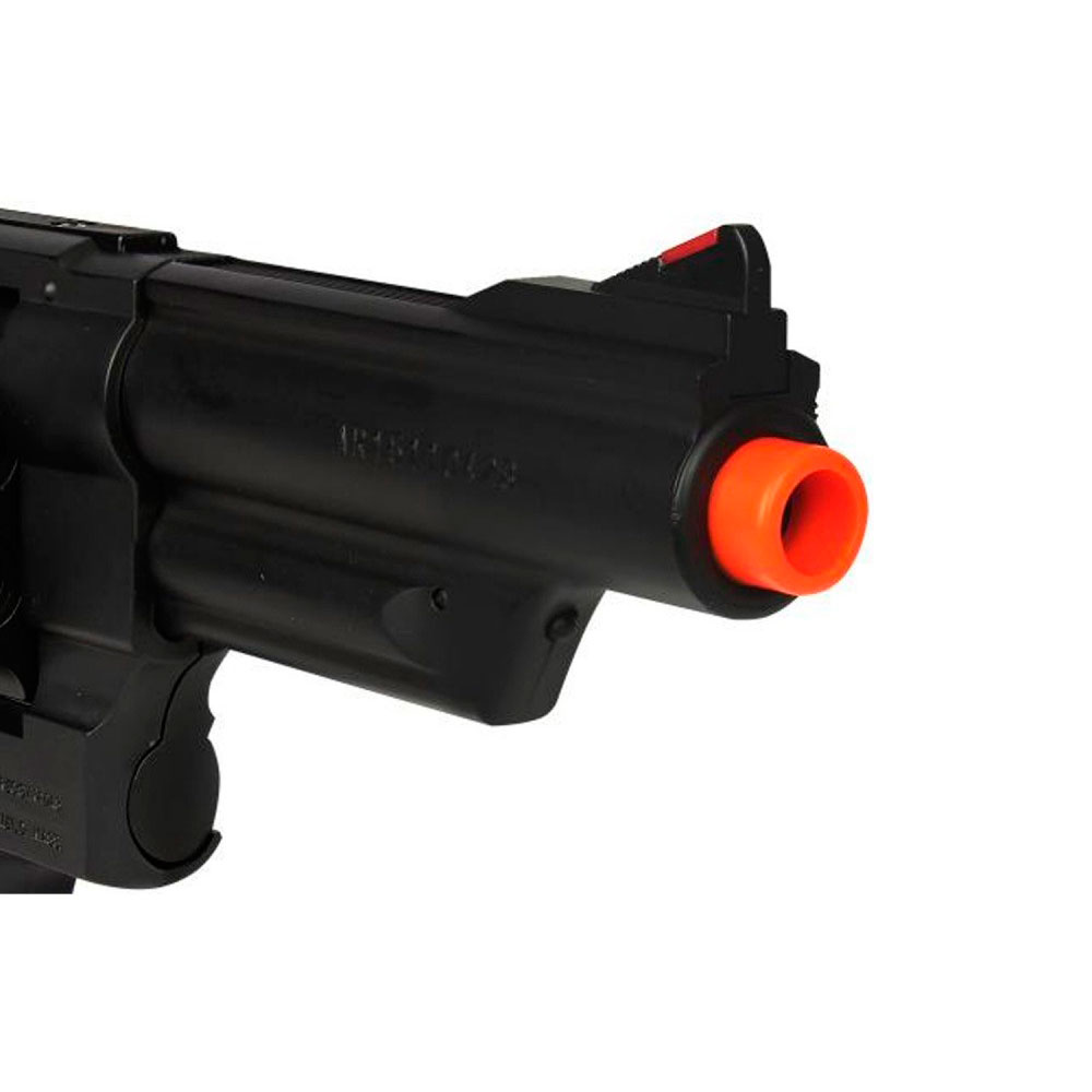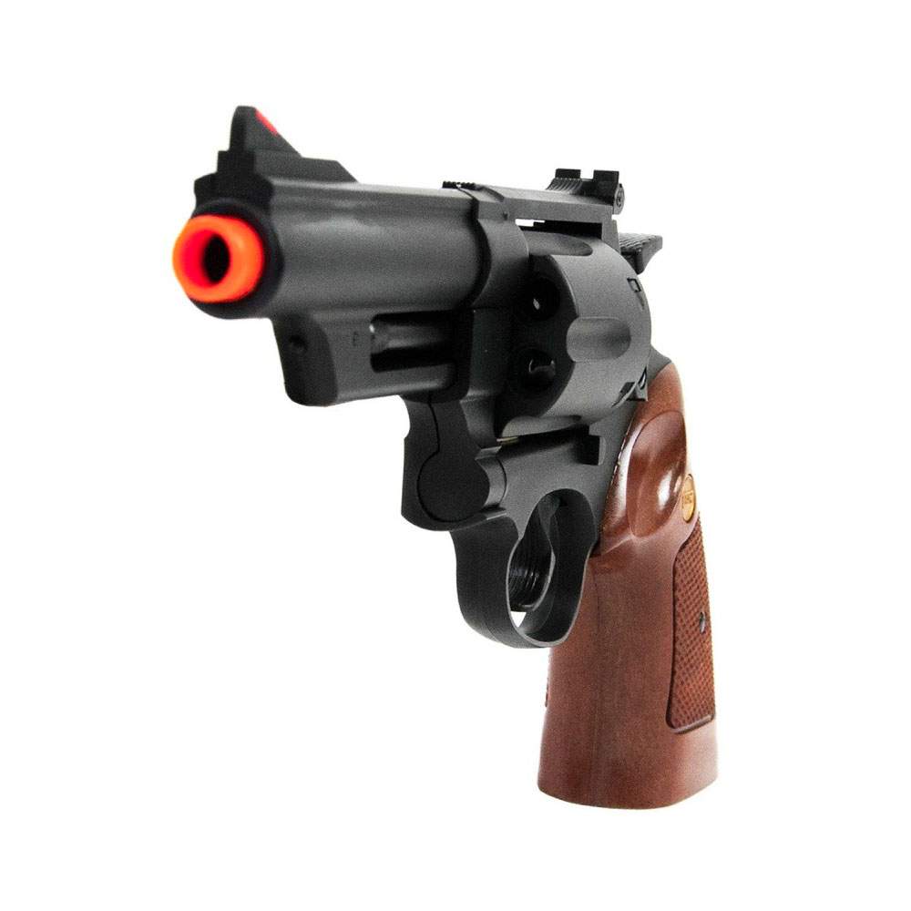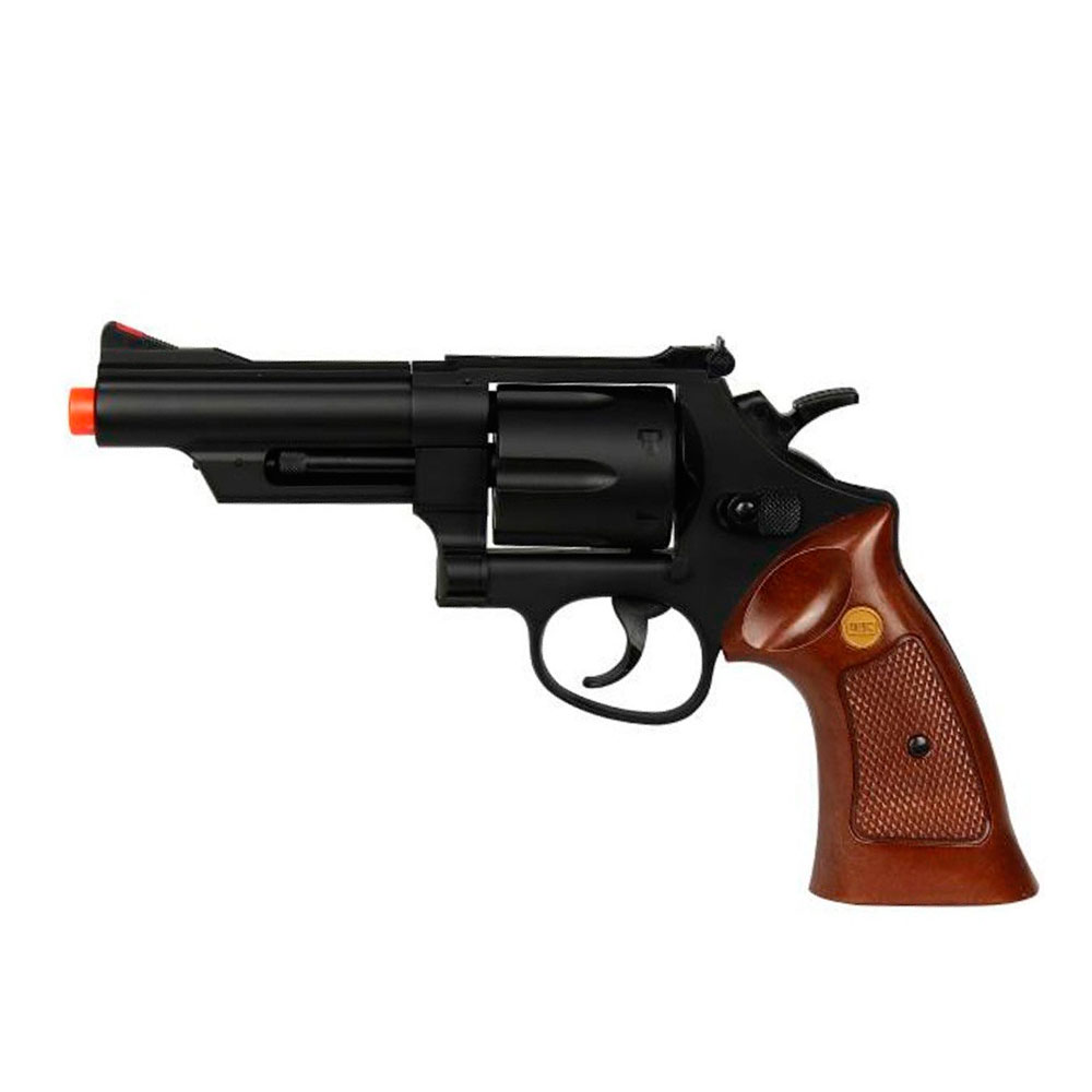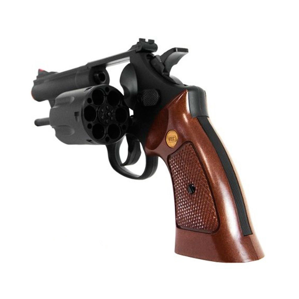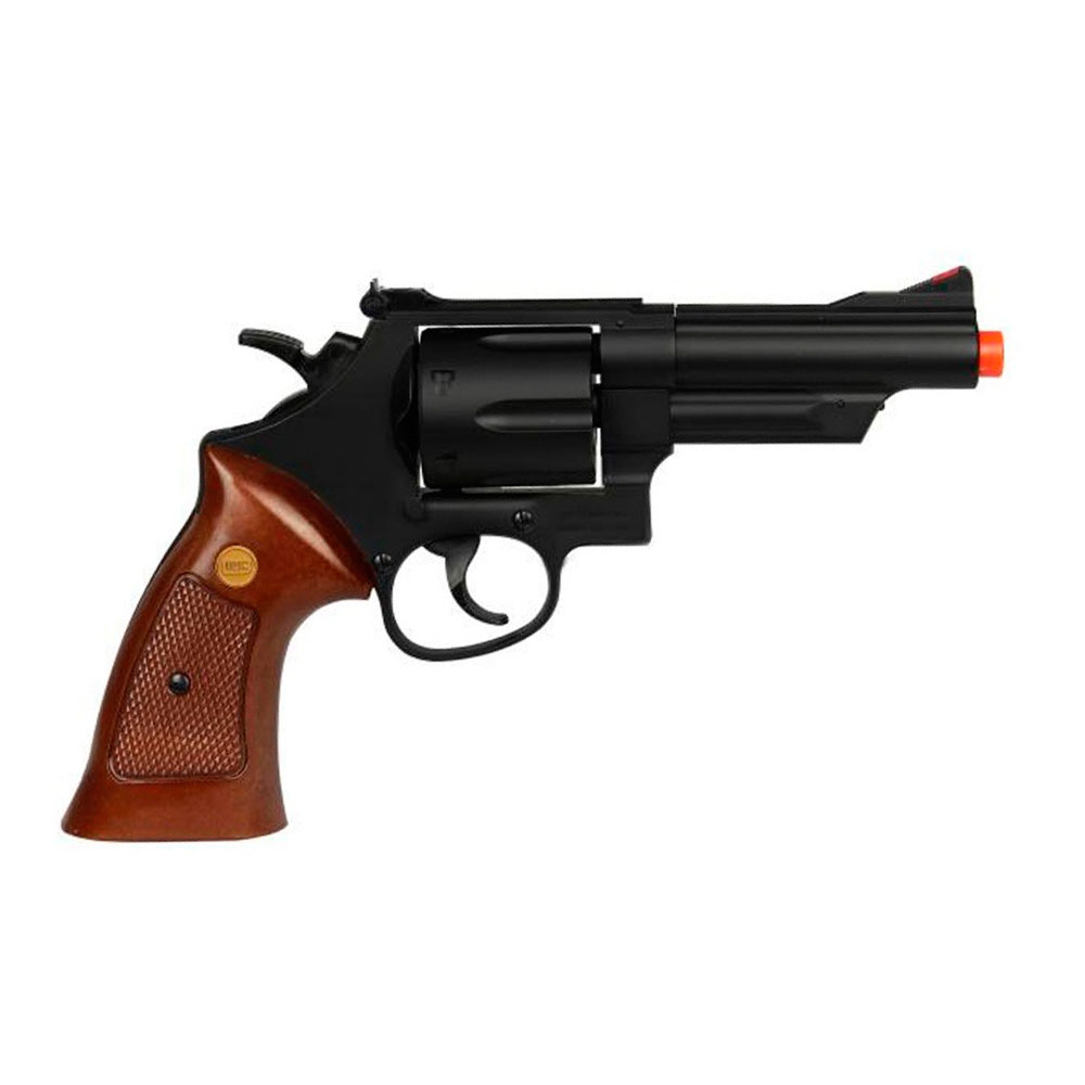 Revólver de airsoft UHC. Indicado para Colecionadores. Não indicado para jogos por se tratar de um modelo toy. Contém sistema de tiro spring, utilizando 6 cartuchos no tambor, contendo uma BB em cada cartucho. A arma possui hop up fixo e é engatilhada como um revólver real, onde puxa-se o cão para trás e engatilha-se a arma com o próximo cartucho. Contém alça de mira regulável e massa de mira fixa com detalhe vermelho para melhor visada do alvo. Construído todo em Plástico ABS, possui cano em metal de 4”, retém do tambor funcional e tambor rotatório conforme se aciona o gatilho.