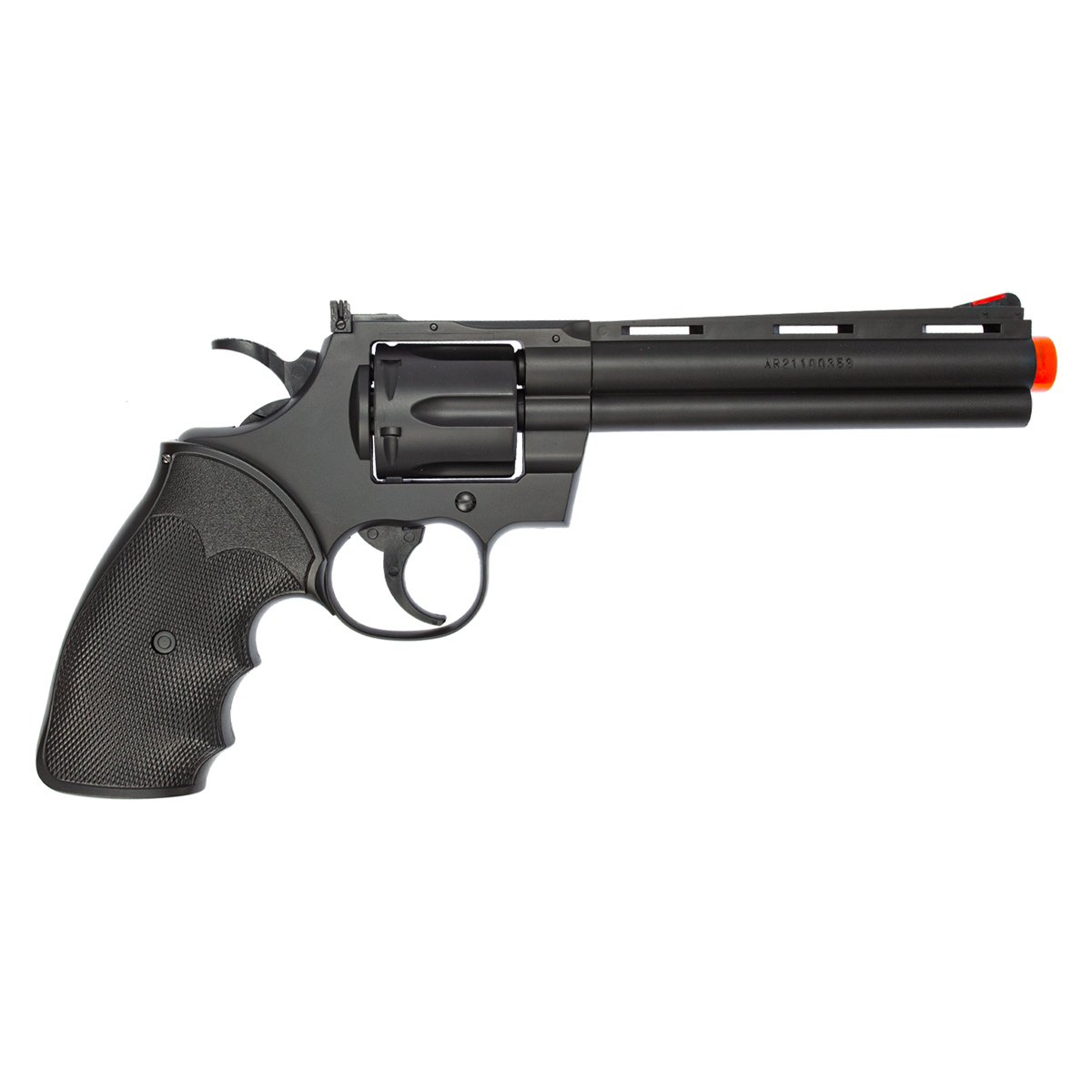 Revólver de cano longo (6 polegadas) modelo Python 357 fabricado pela UHC. Uma Arma Airsoft com ação Spring (repetição manual) que possui construção em ABS na cor preta.