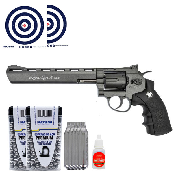 REVÓLVER ROSSI CO2 703B METAL 4.5MM + ESFERAS DE AÇO + ÓLEO DE SILICONE + CILINDROS CO2 E ALVOS 14X14