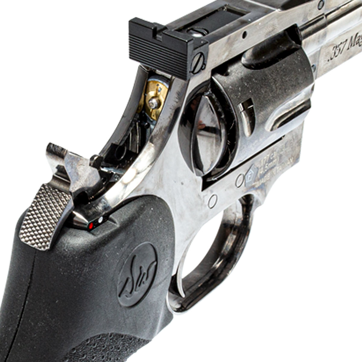 Já o sistema de disparo é semi automático e com gatilho de ação dupla, aumentando ainda mais o realismo do revólver.