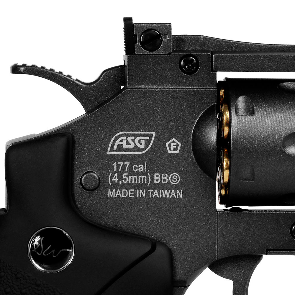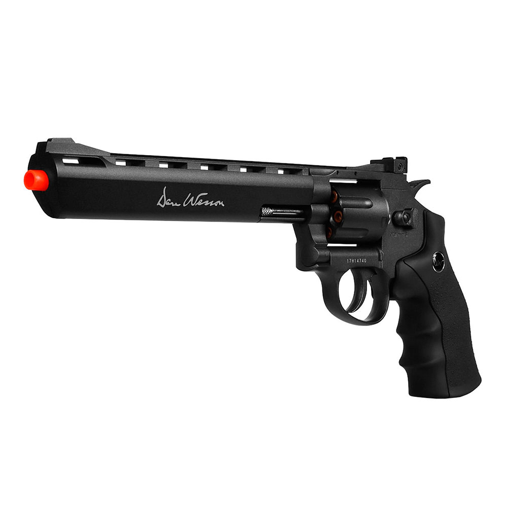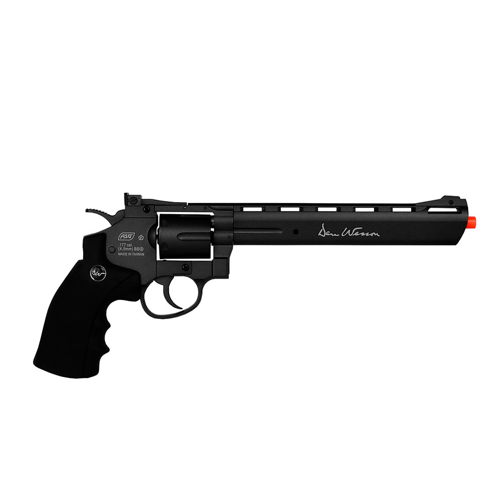 Revólver de Pressão Co2 ASG Dan Wesson com cano de 8 polegadas no calibre 4.5mm. Construído em metal, é um modelo que impressiona em seu acabamento grafite com punho ergonômico em polímero.