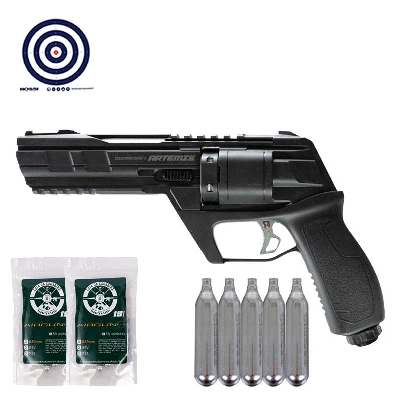 Combo com o Revólver Artemis .50 CP300! Acompanha Esferas .50 para municiar seu revólver, Cilindros de CO2 para impulsionar seus tiros e Alvos de Treino Rossi.