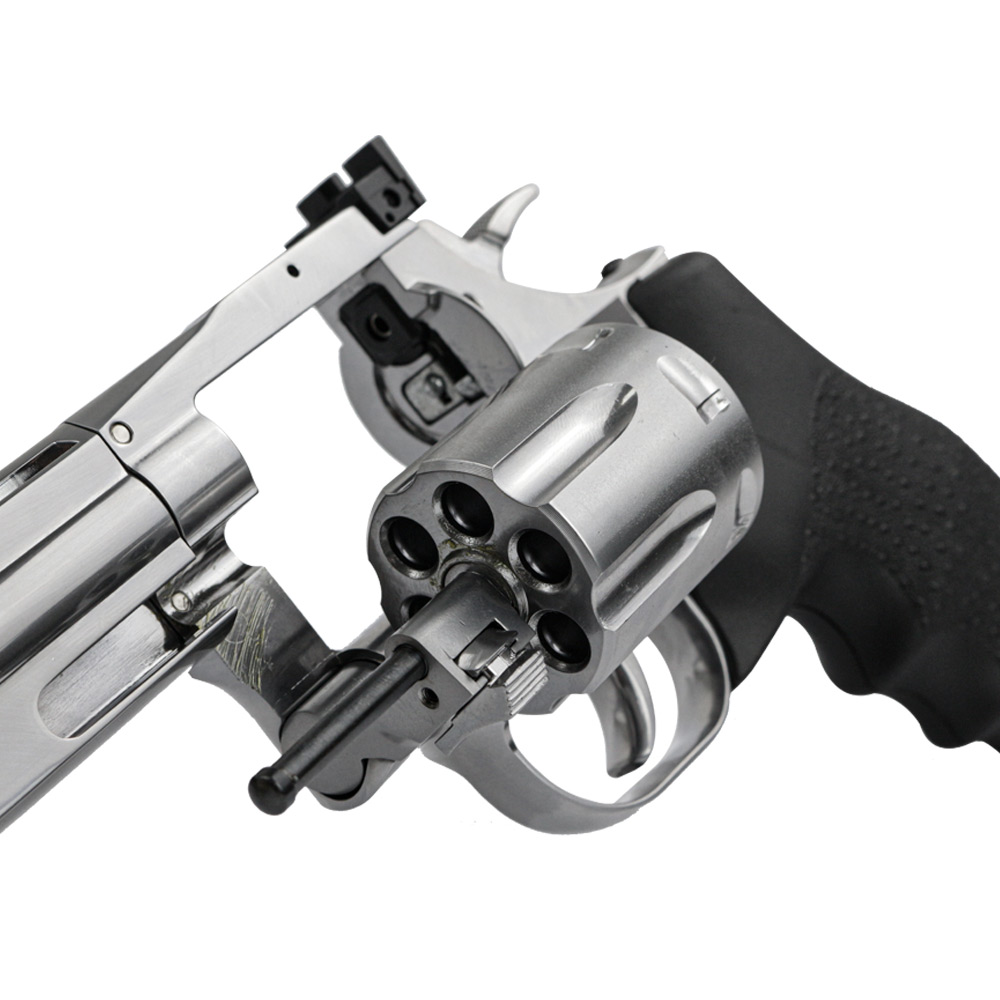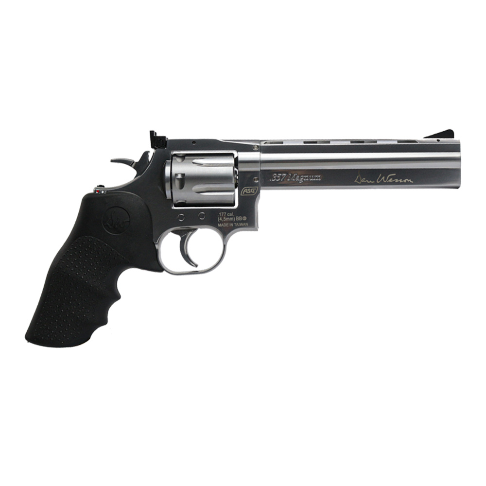 Revólver Cromado, fabricado pela ASG em Full Metal com ação semi-automática e sistema de propulsão por cilindro co2 12g. Modelo 715 Licenciado pela Dan Wesson com cano de precisão de 6 polegadas.