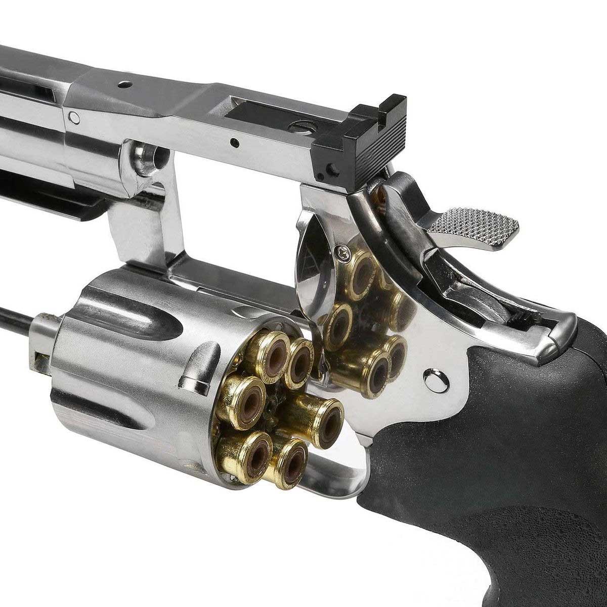 O tambor possui capacidade para 6 cápsulas individuais, onde cada chumbinho é inserido separadamente em um cartucho. Esse sistema reproduz fielmente o carregamento de um revólver tradicional e contribui para uma experiência muito mais realista.