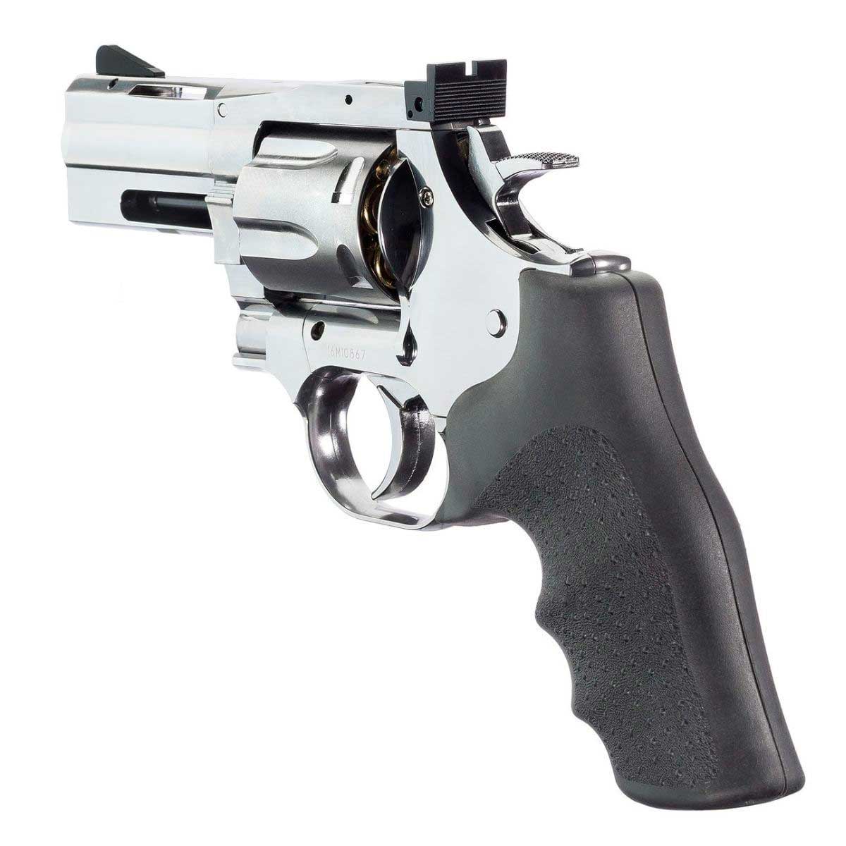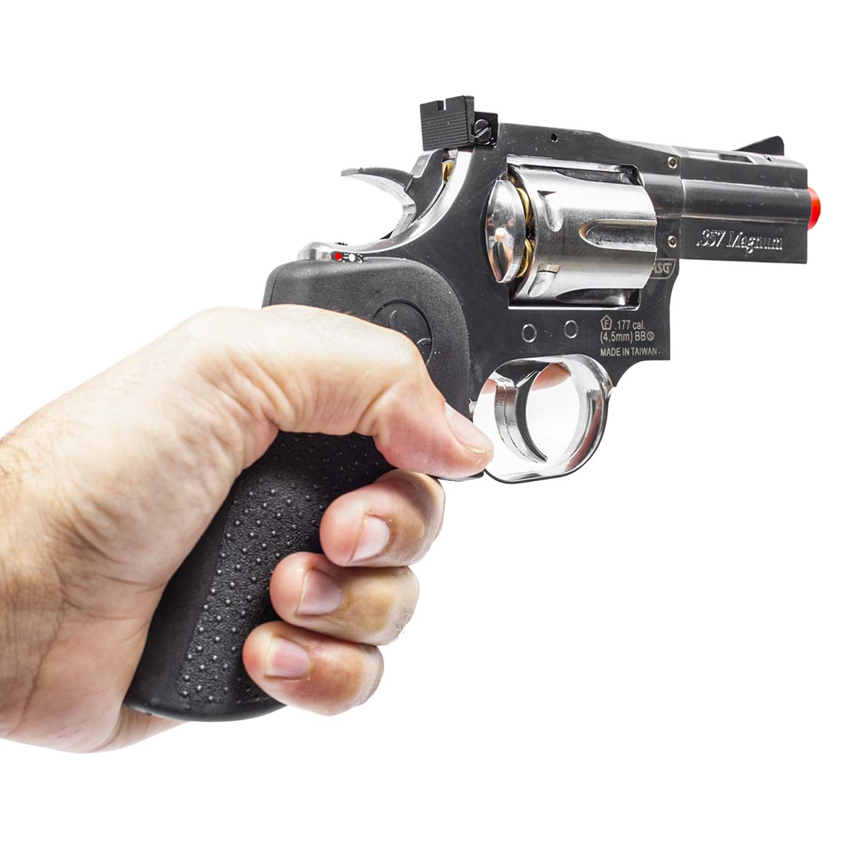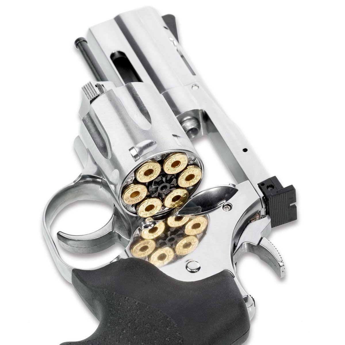 Um dos grandes diferenciais do modelo é o tambor com 6 cápsulas individuais de latão, que reproduz fielmente o sistema de carregamento de um revólver tradicional. Cada esfera de aço é inserida em um cartucho individual, permitindo inclusive a ejeção das cápsulas através da haste extratora, elevando significativamente o nível de realismo durante o uso.