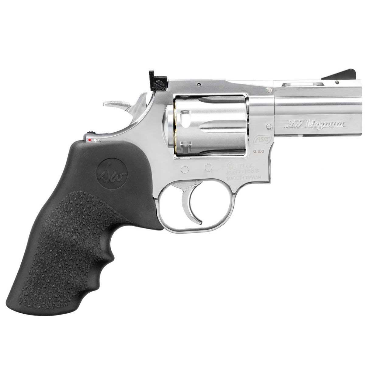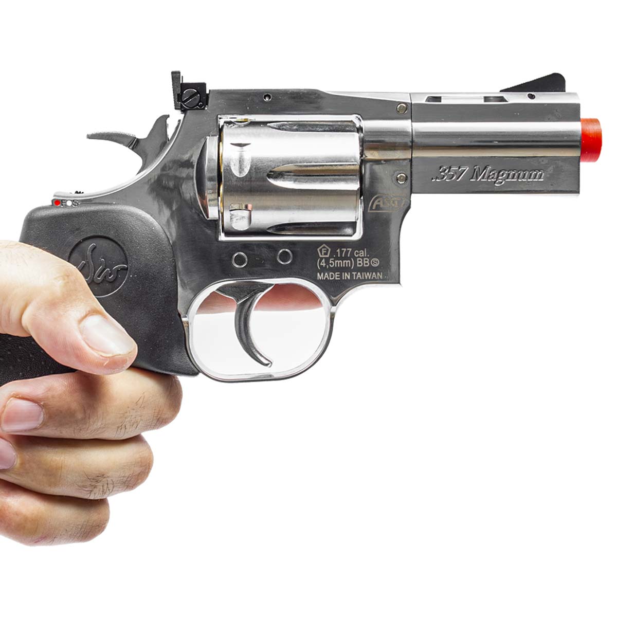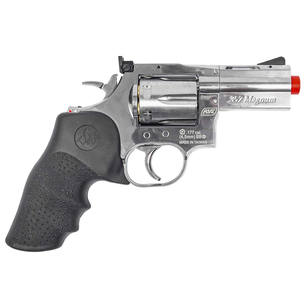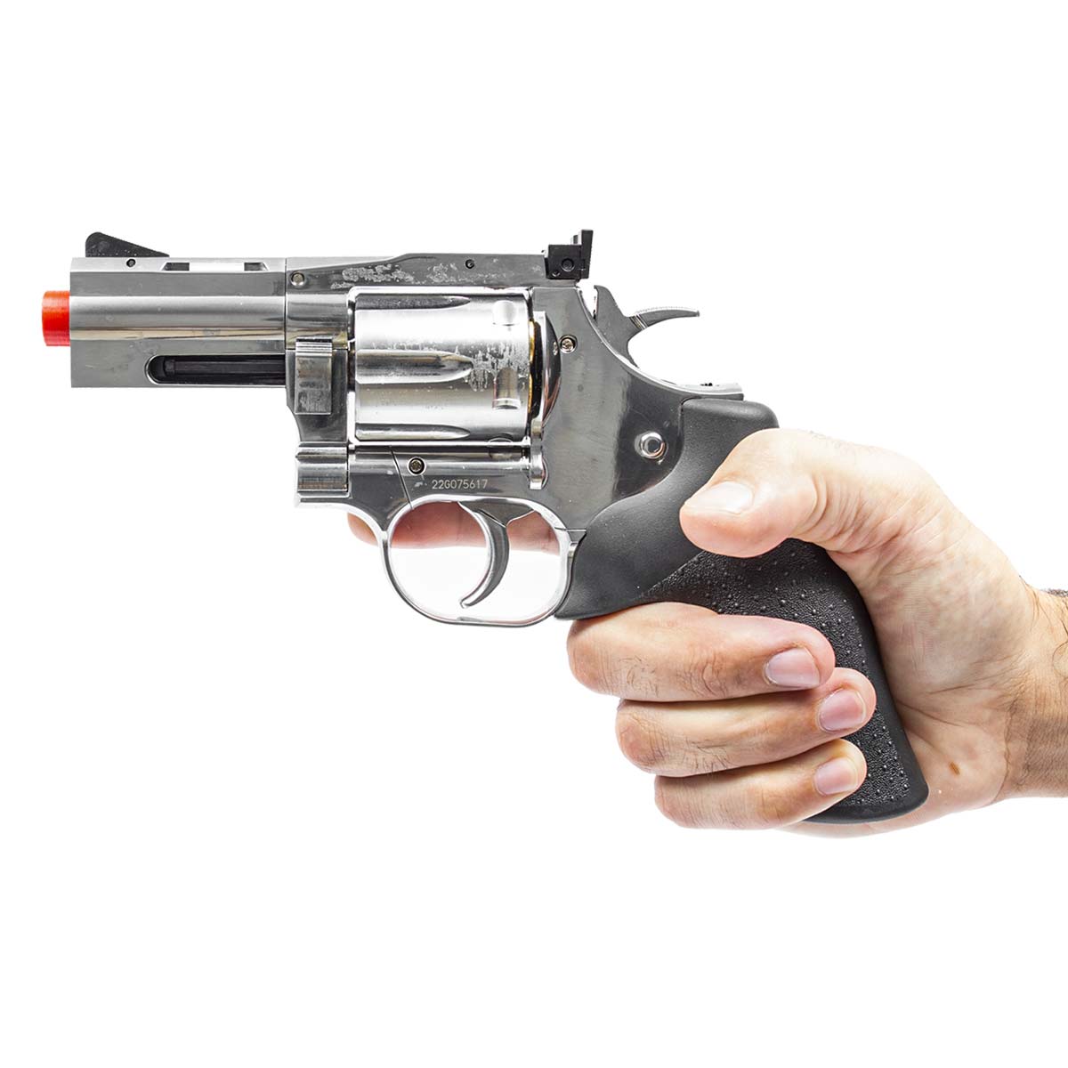Um dos grandes diferenciais do modelo é o tambor com 6 cápsulas individuais de latão, que reproduz fielmente o sistema de carregamento de um revólver tradicional. Cada esfera de aço é inserida em um cartucho individual, permitindo inclusive a ejeção das cápsulas através da haste extratora, elevando significativamente o nível de realismo durante o uso.