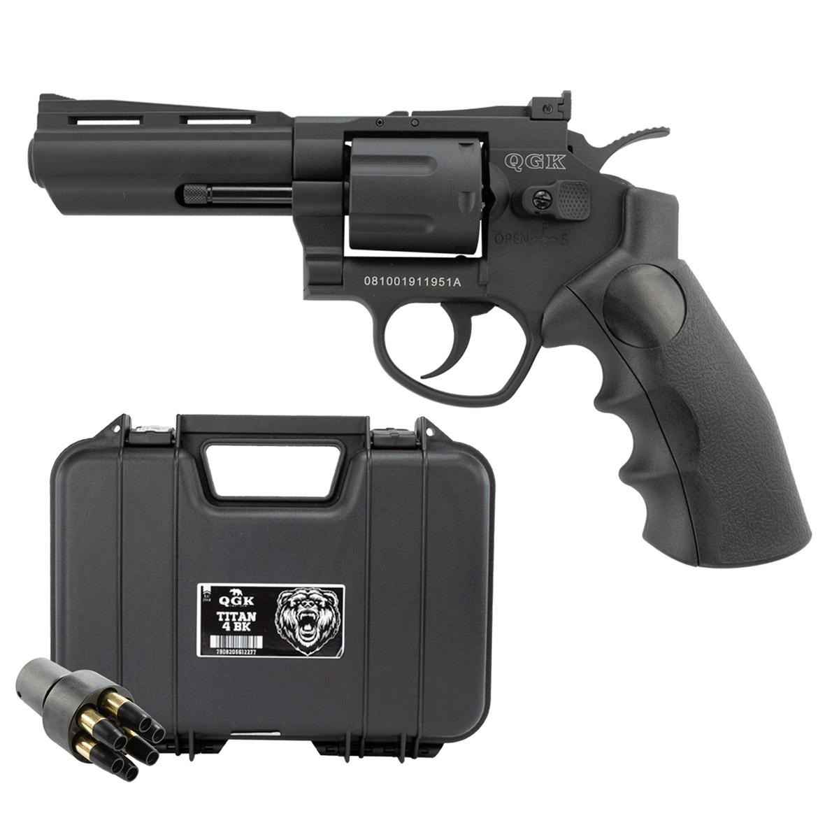 Revólver de Pressão com sistema de propulsão por Co2, modelo Titan da QGK com cano de 4".