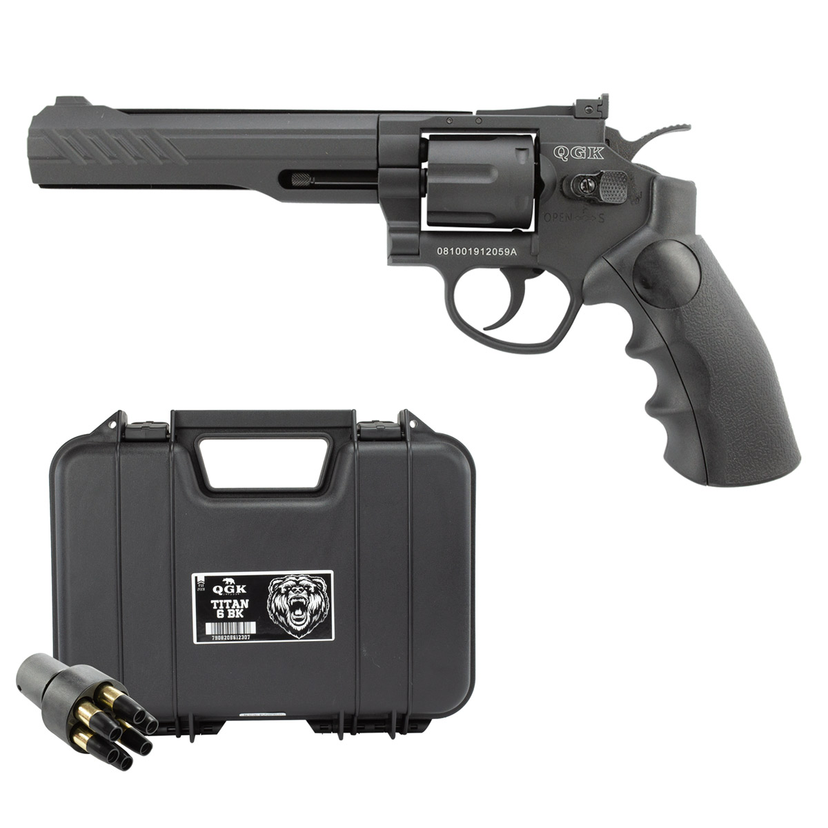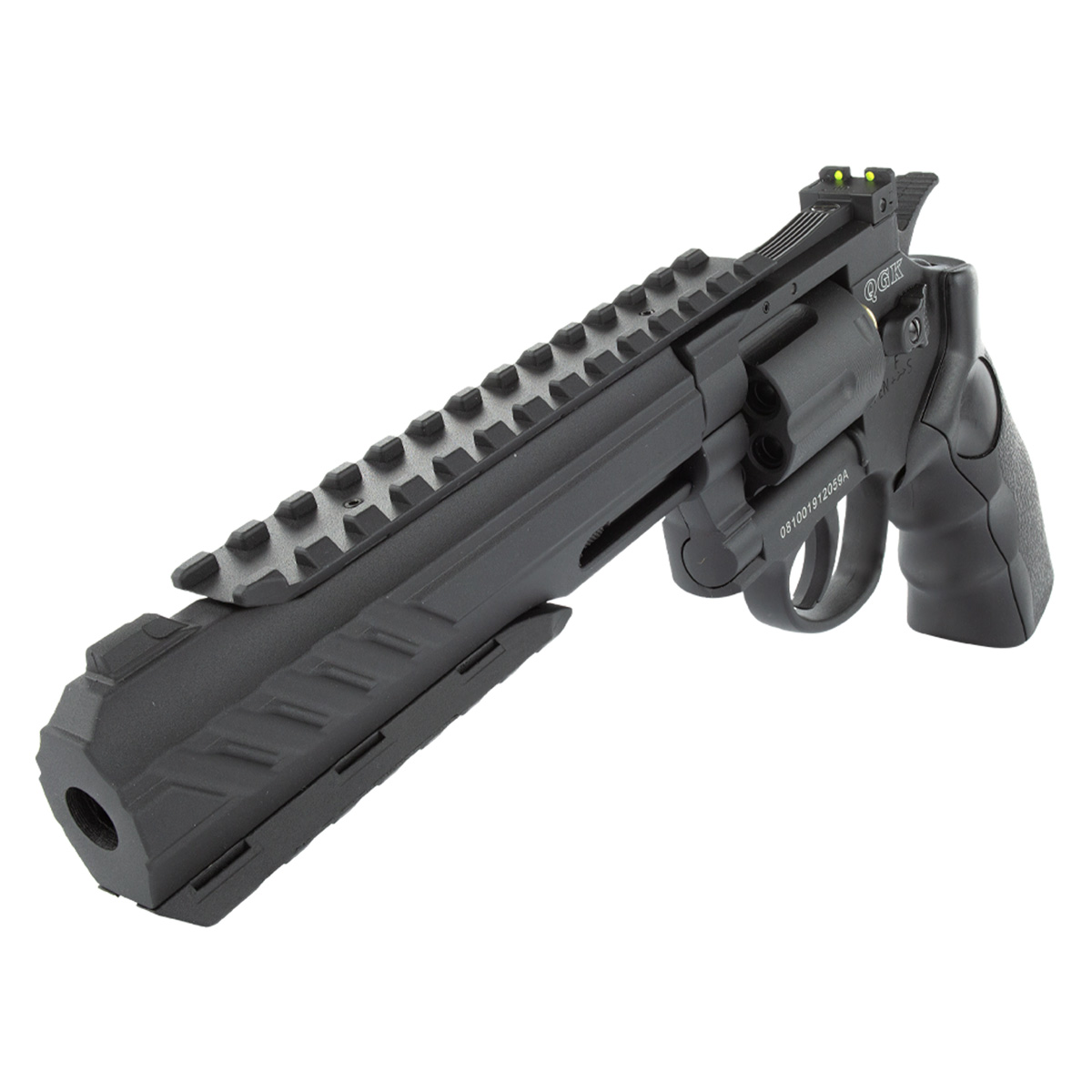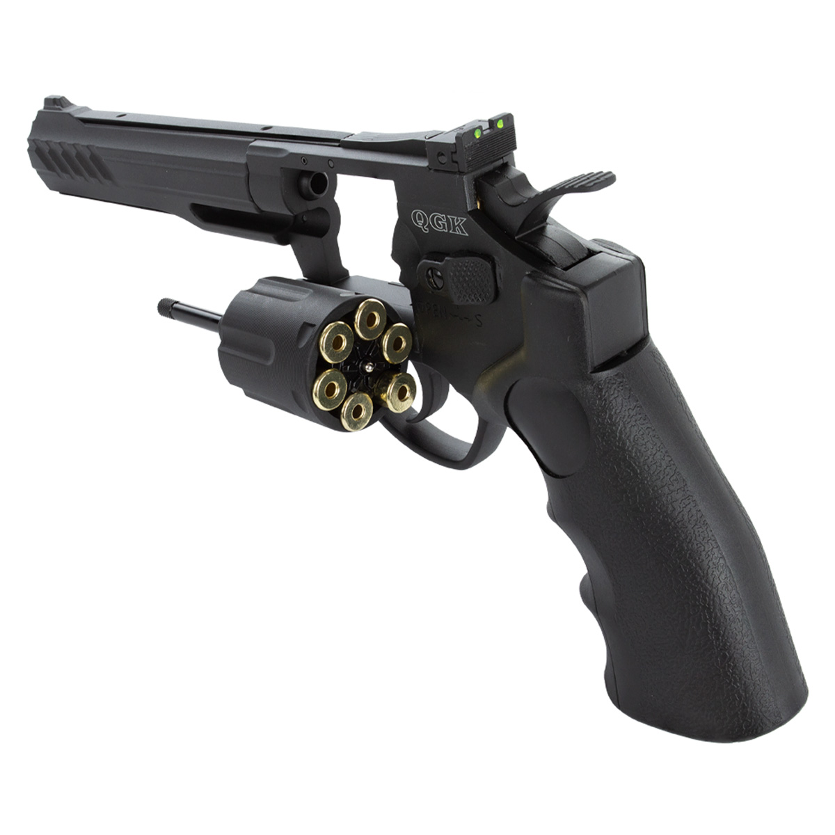 Revólver de pressão fabricado pela QGK, modelo Titan com cano de 6 polegadas e com construção em full metal.