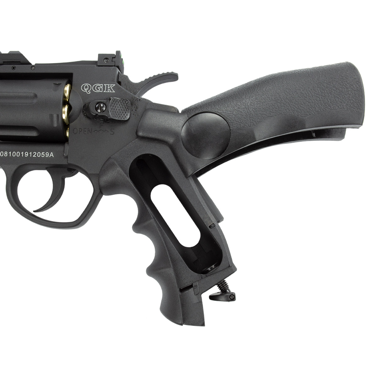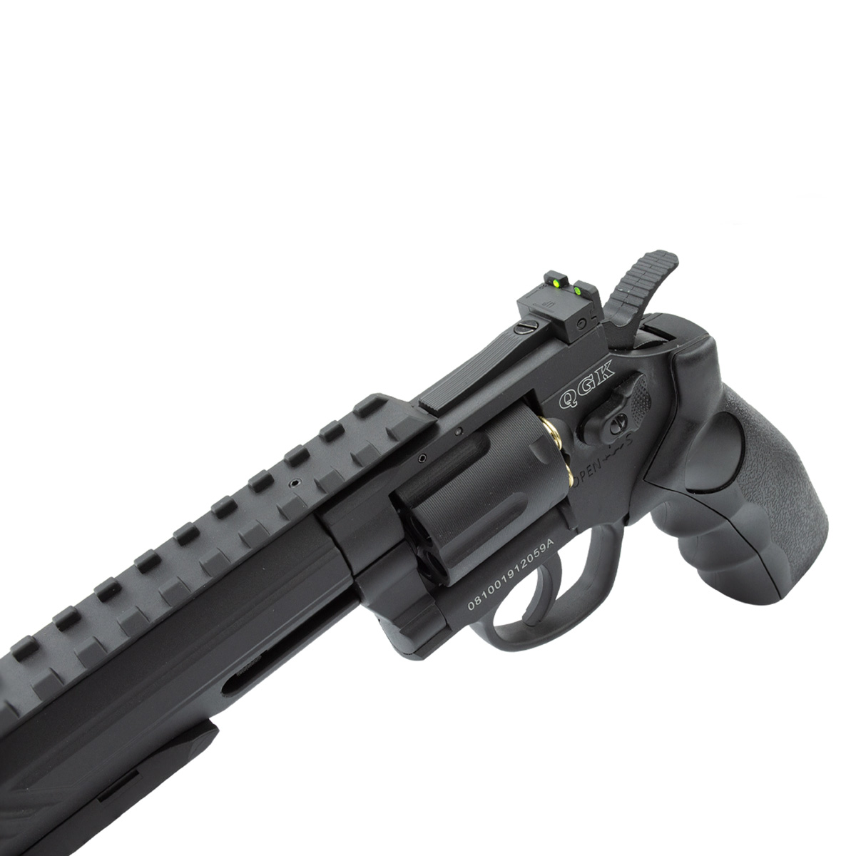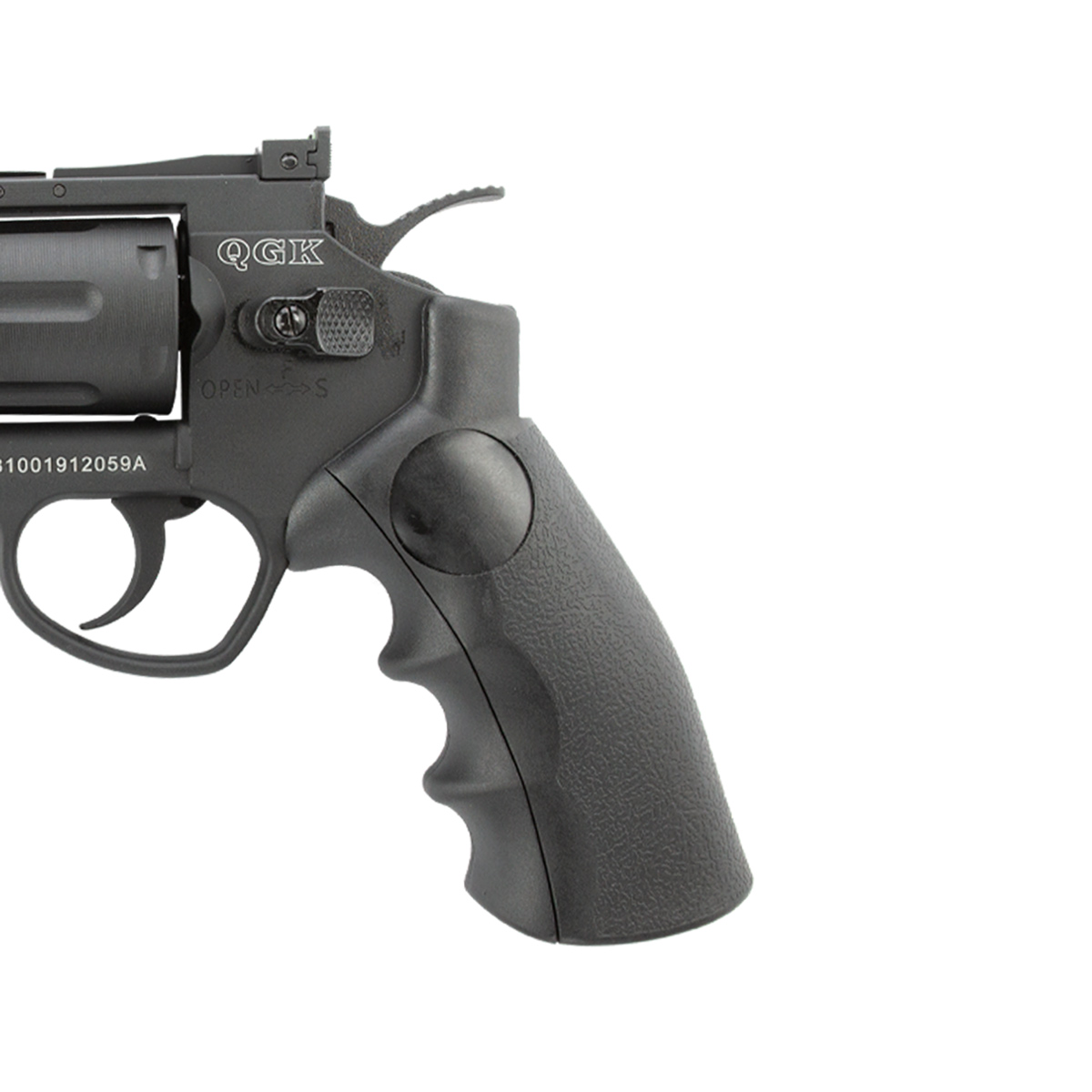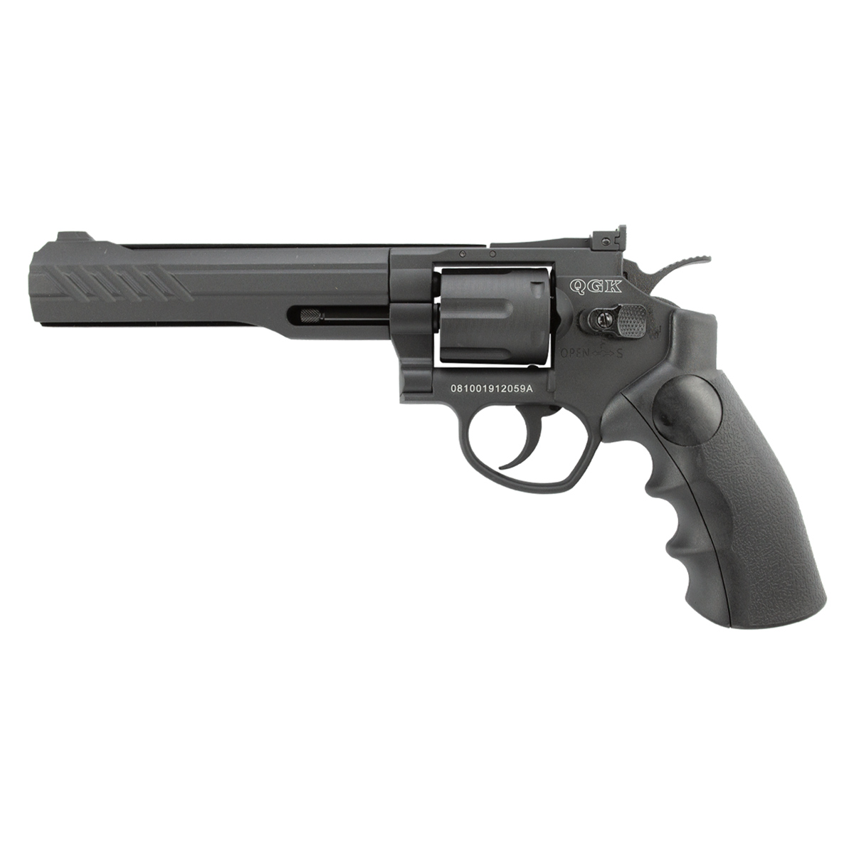Revólver de pressão fabricado pela QGK, modelo Titan com cano de 6 polegadas e com construção em full metal.